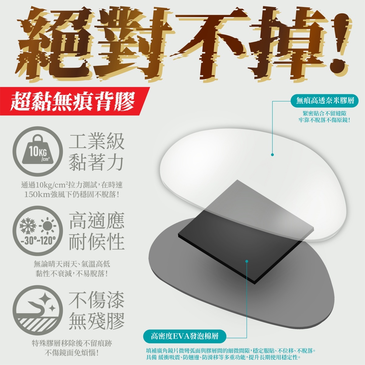 ●鏡片皆以原廠後照鏡尺寸開發,專車專用,若您有改裝後照鏡會無法安裝,購買/撕除背膠黏貼前請確認形狀是否一致。