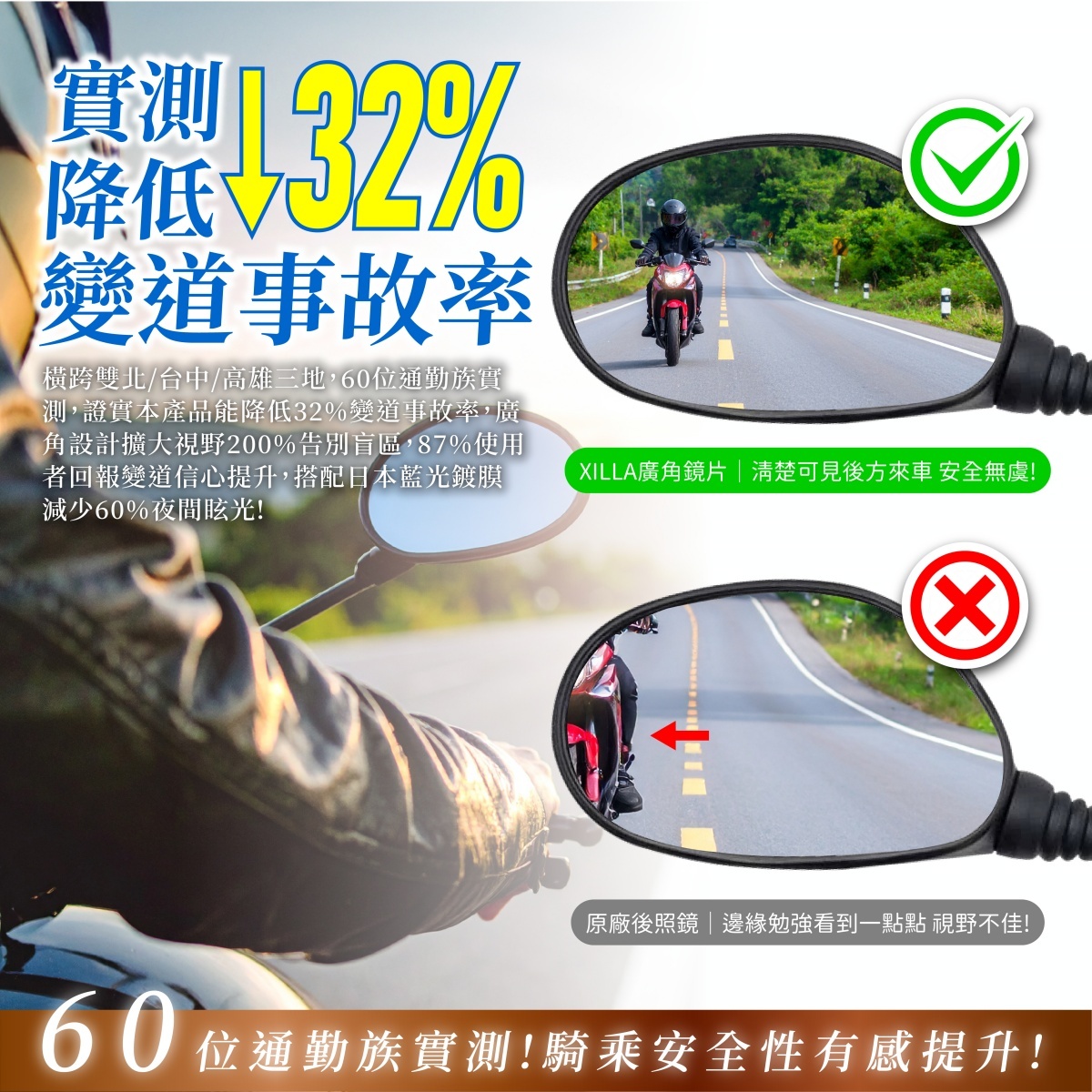橫跨雙北/台中/高雄三地,60位通勤族實測,證實本產品能降低32%變道事故率,廣角設計擴大視野200%告別盲區,87%使用者回報變道信心提升,搭配日本藍光鍍膜減少60%夜間眩光