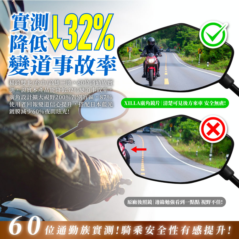橫跨雙北/台中/高雄三地,60位通勤族實測,證實本產品能降低32%變道事故率,廣角設計擴大視野200%告別盲區,87%使用者回報變道信心提升,搭配日本藍光鍍膜減少60%夜間眩光