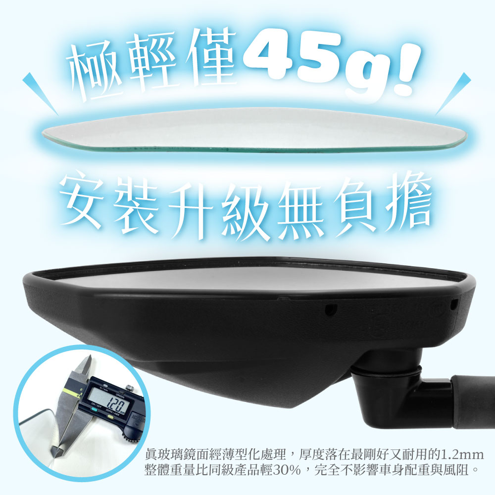 真玻璃鏡面經 薄型化處理(厚度 1.2mm),整體重量比同級產品輕 30%,完全不影響車身配重與風阻。