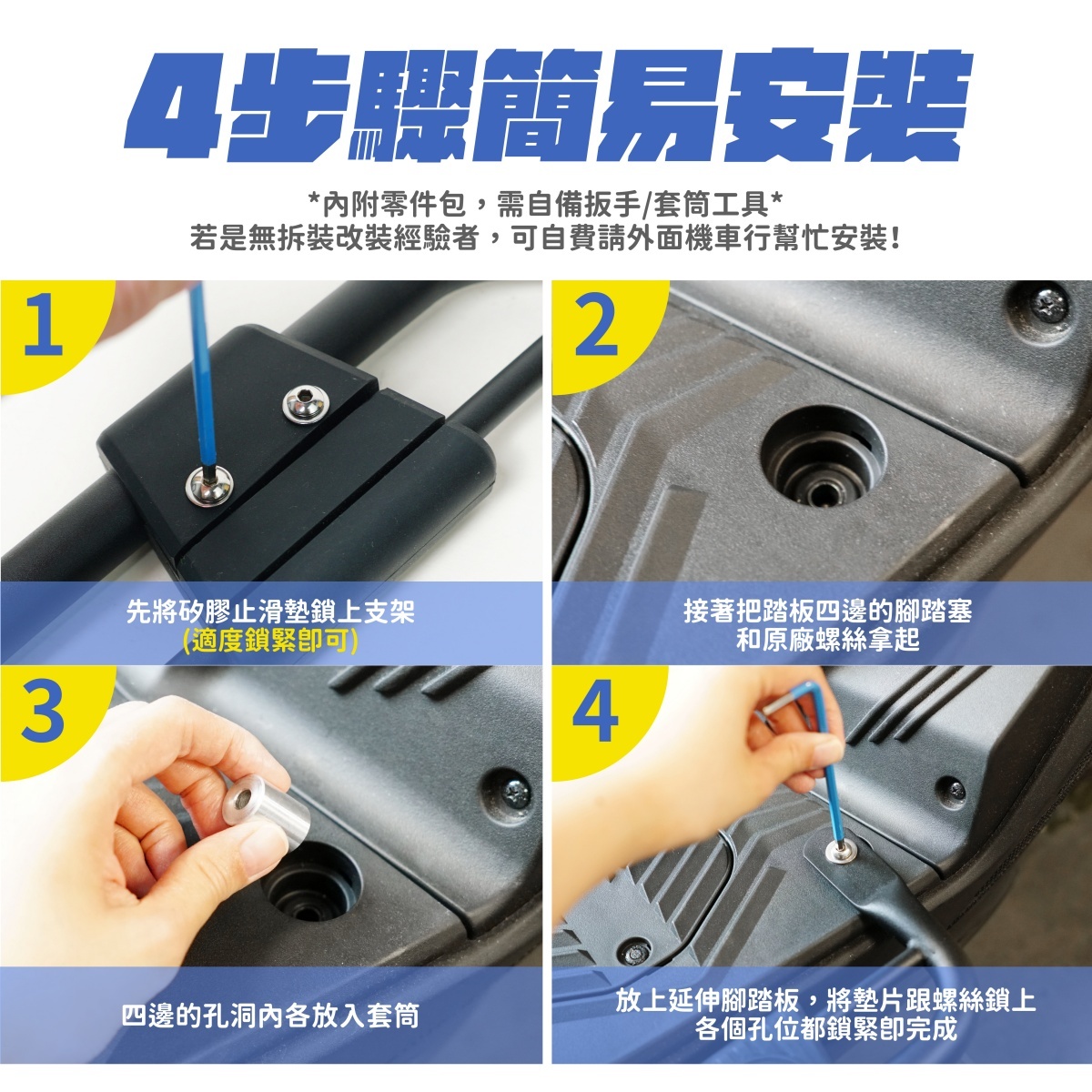 矽膠止滑延伸腳踏板,專為 KYMCO RTSR 165/RTS 135 車款開模打造,精準貼合不卡卡,讓腳踏空間瞬間升級!採用市售唯一可調式矽膠止滑墊,踩踏更舒適、止滑更有感。高強度不鏽鋼支架支撐穩固,不易變形,無論長途通勤或日常代步都能安心踩踏。延伸空間可放包包、紙箱、安全帽,解決腳沒地方放的困擾;更貼心避位設計,不干擾雙腳自然踩地。安裝簡便無須拆殼,鎖上即用,DIY也能輕鬆搞定。視覺造型俐落有型,讓機車外觀與騎乘體驗同步升級!