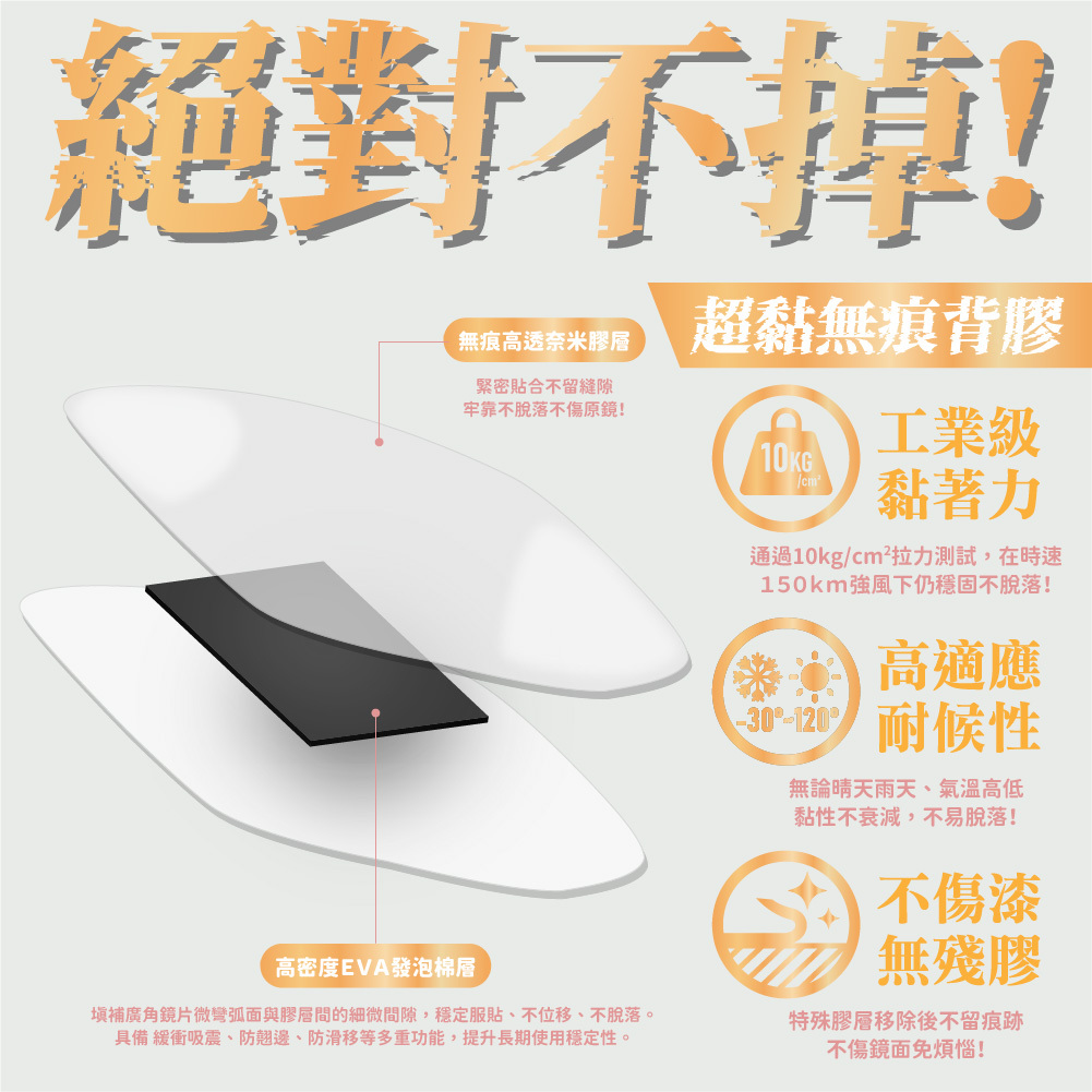 ●鏡片皆以原廠後照鏡尺寸開發,專車專用,若您有改裝後照鏡會無法安裝,購買/撕除背膠黏貼前請確認形狀是否一致。
