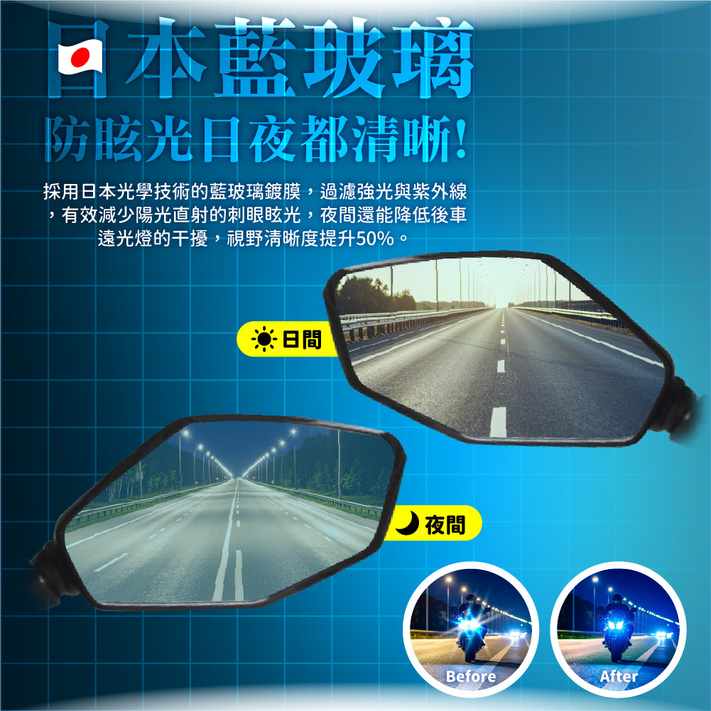採用日本光學技術的藍玻璃鍍膜,過濾強光與紫外線,有效減少陽光直射的刺眼眩光,夜間還能降低後車遠光燈的干擾,視野清晰度提升50%。