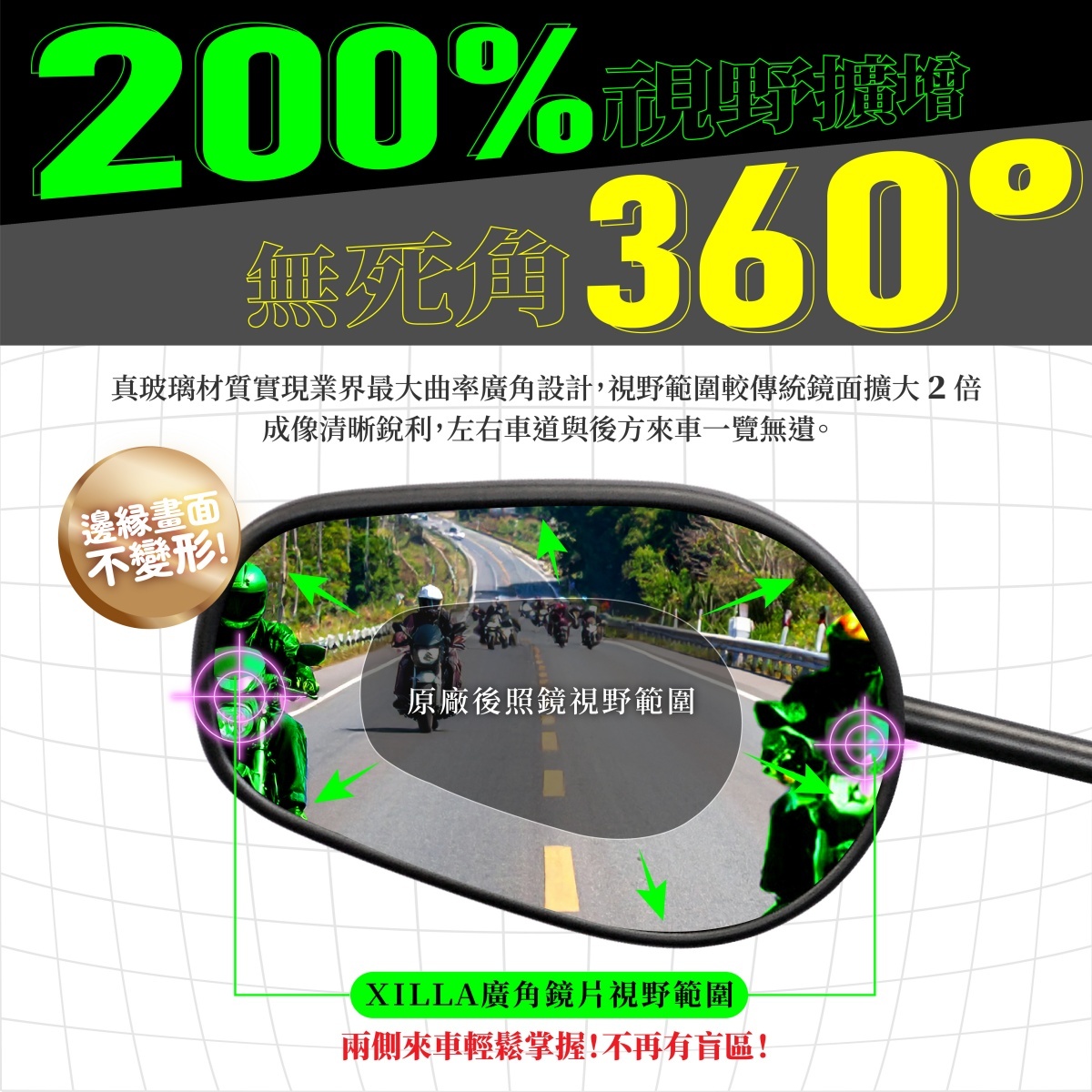 真玻璃材質實現 業界最大曲率 廣角設計,視野範圍較傳統鏡面擴大 2 倍,且邊緣無魚眼變形,左右車道與後方來車一覽無遺。