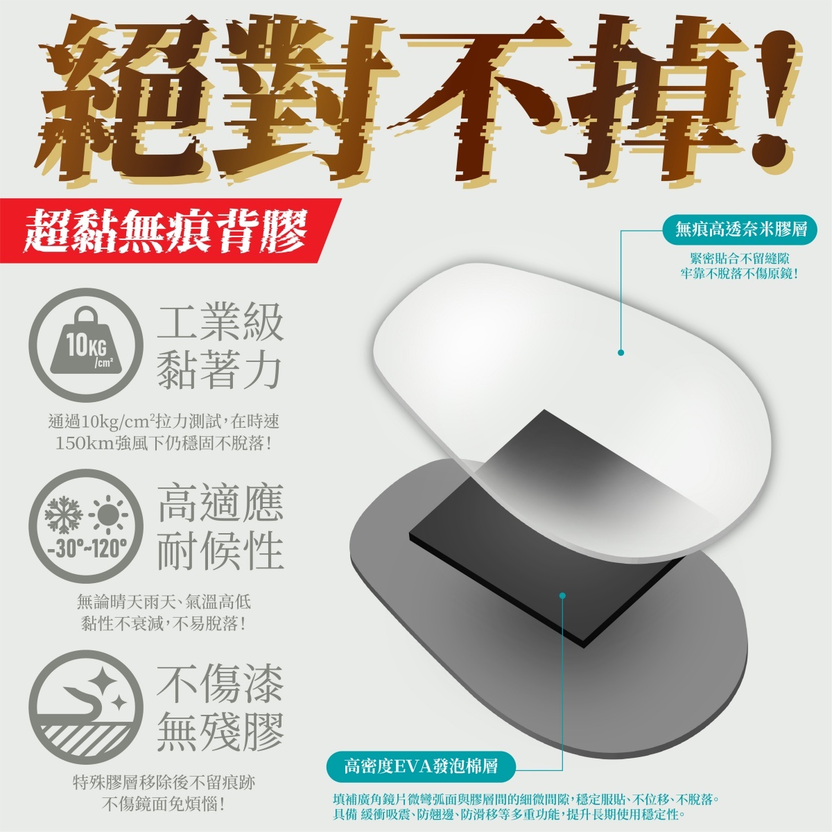 ●鏡片皆以原廠後照鏡尺寸開發,專車專用,若您有改裝後照鏡會無法安裝,購買/撕除背膠黏貼前請確認形狀是否一致。