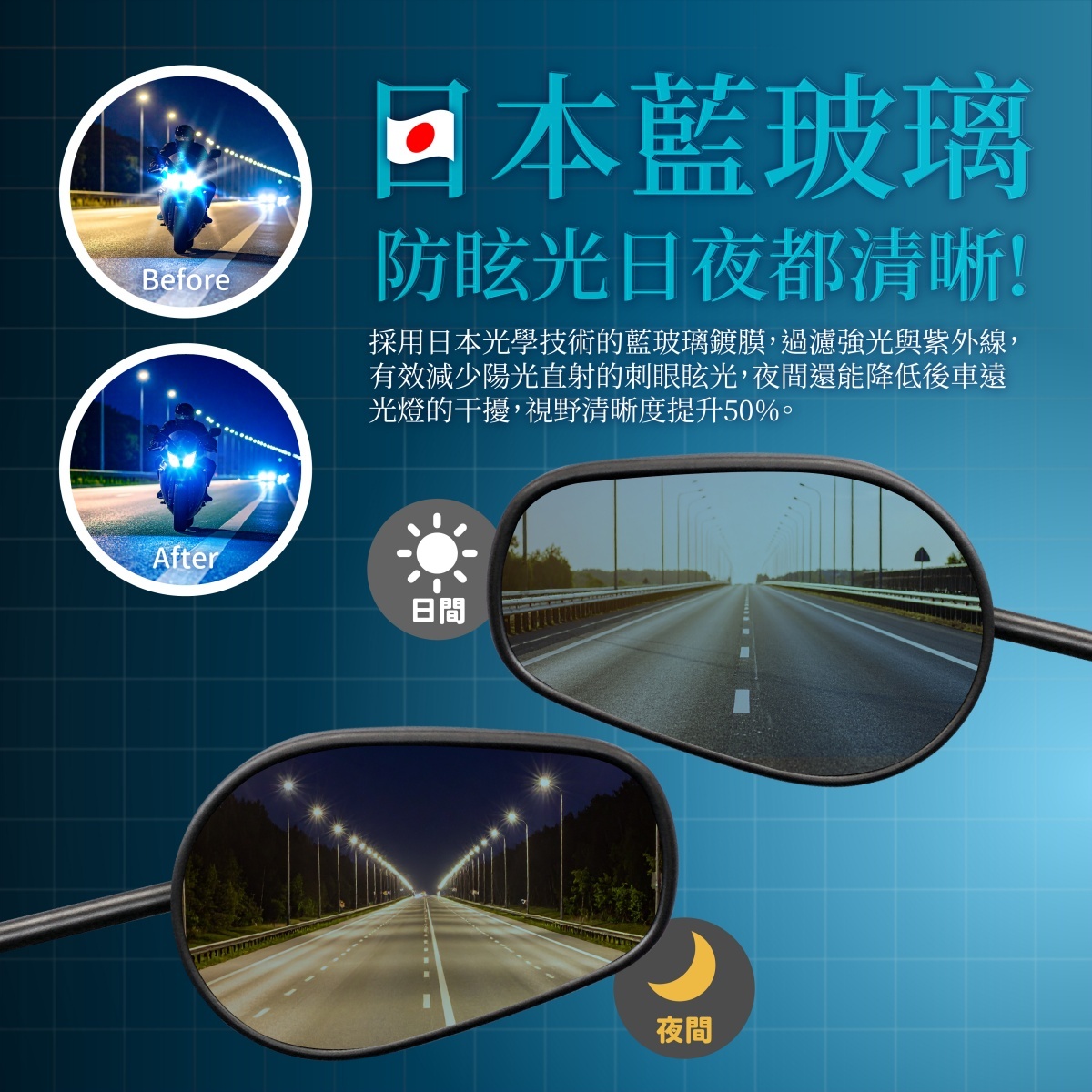 採用日本光學技術的藍玻璃鍍膜,過濾強光與紫外線,有效減少陽光直射的刺眼眩光,夜間還能降低後車遠光燈的干擾,視野清晰度提升50%。