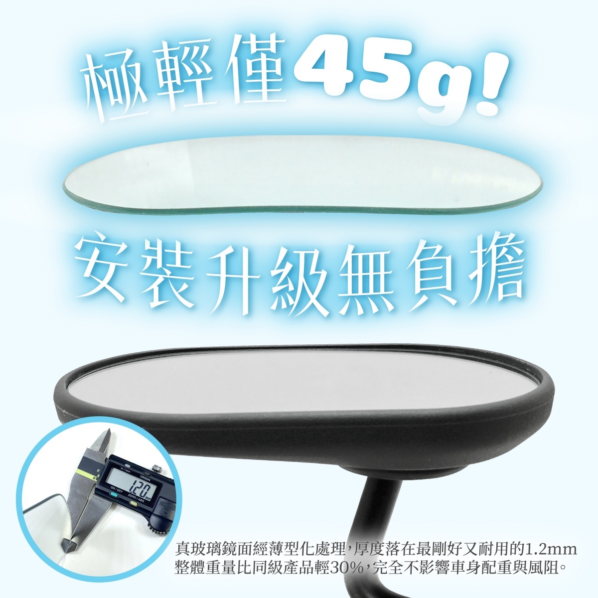 真玻璃鏡面經 薄型化處理(厚度 1.2mm),整體重量比同級產品輕 30%,完全不影響車身配重與風阻。