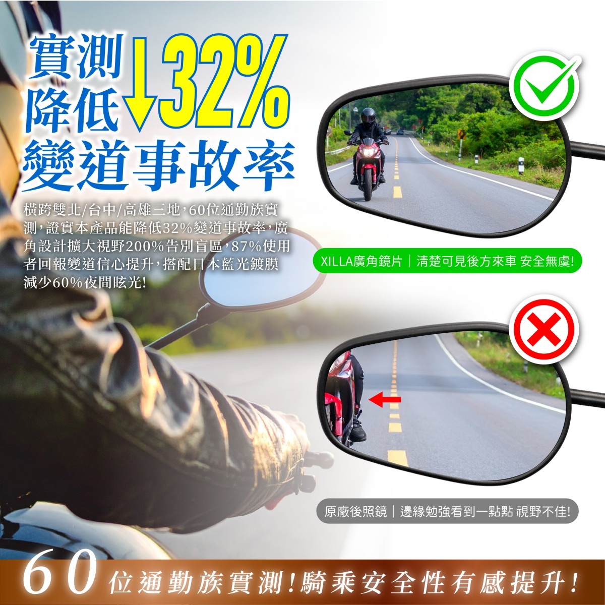 橫跨雙北/台中/高雄三地,60位通勤族實測,證實本產品能降低32%變道事故率,廣角設計擴大視野200%告別盲區,87%使用者回報變道信心提升,搭配日本藍光鍍膜減少60%夜間眩光