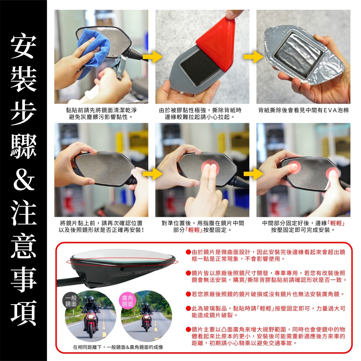 ●鏡片主要以凸面廣角來增大視野範圍,同時也會使鏡中的物體看起來比原本的更小,安裝後可能需重新適應後方來車的距離,初期請小心騎乘以避免交通事故。