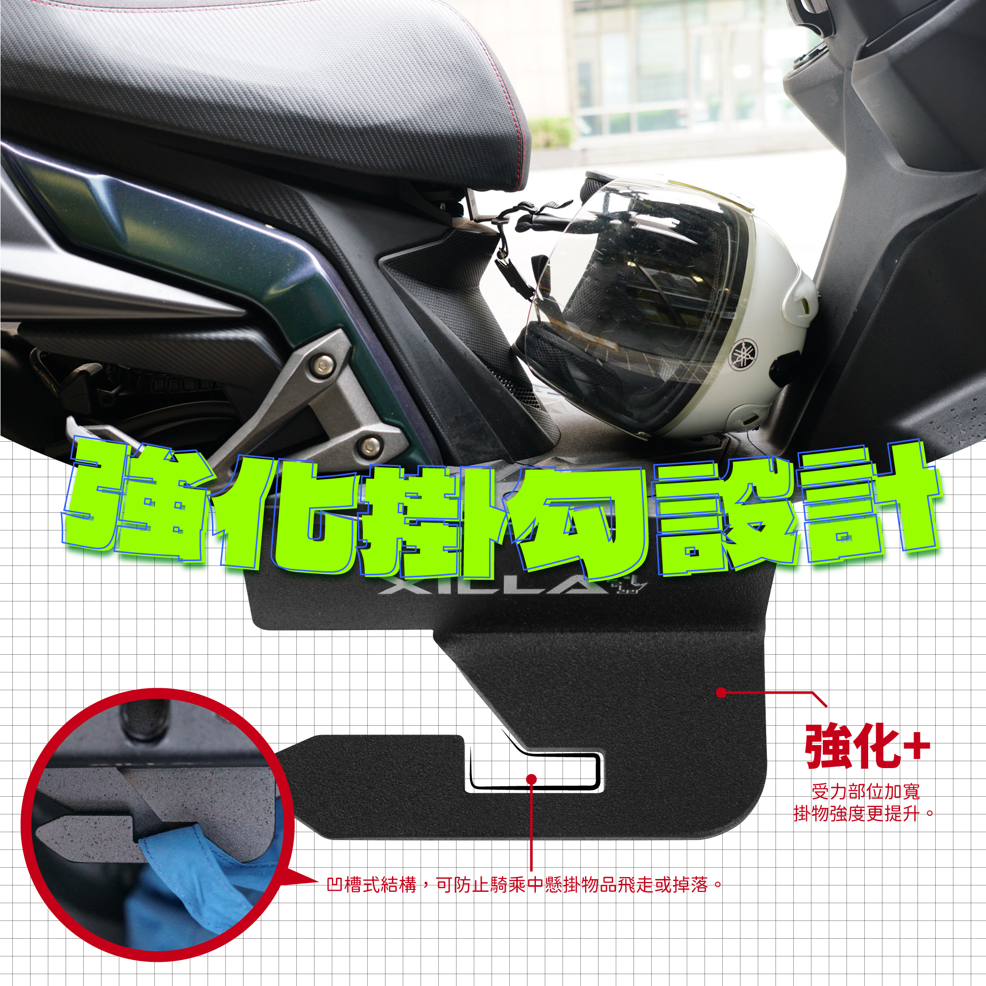 ✅掛安全帽、溼答答的抹布都超方便!不使用時也不會卡到腳部!