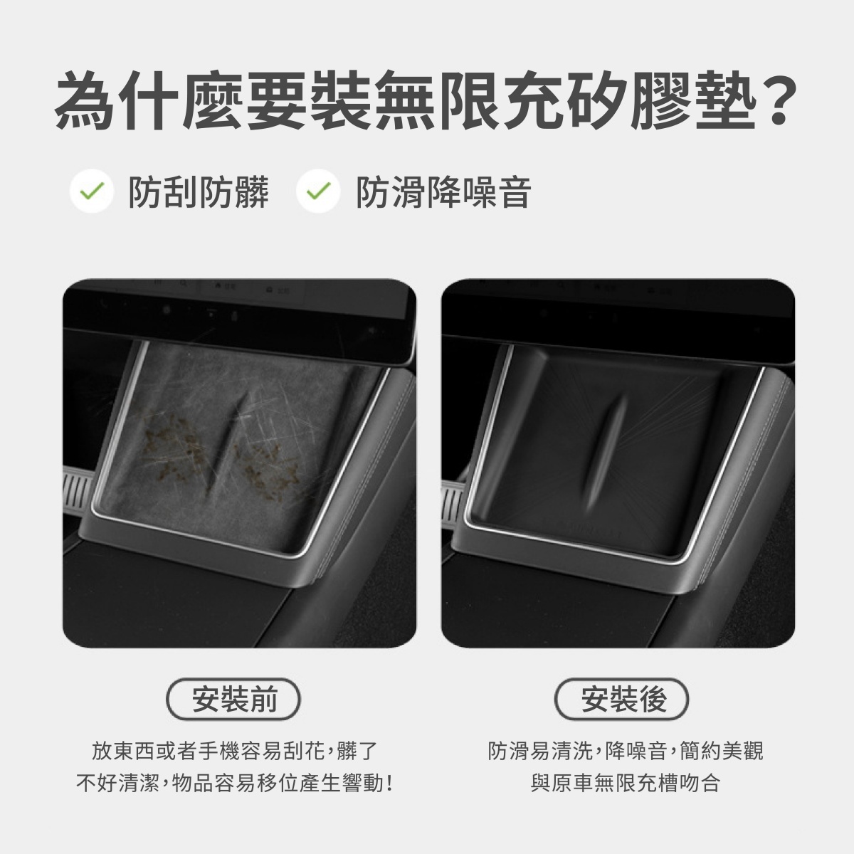 此外,矽膠材質具備出色的耐磨與抗刮能力,能有效保護中控區域,減少日常使用中的磨損與刮傷。可水洗設計讓清潔更加便利,只需簡單沖洗或擦拭,即可恢復如新,維持車內整潔。安裝過程快速簡單,無需額外工具,不會影響無線充電功能,確保中控區域保持原有的實用性與便利性。