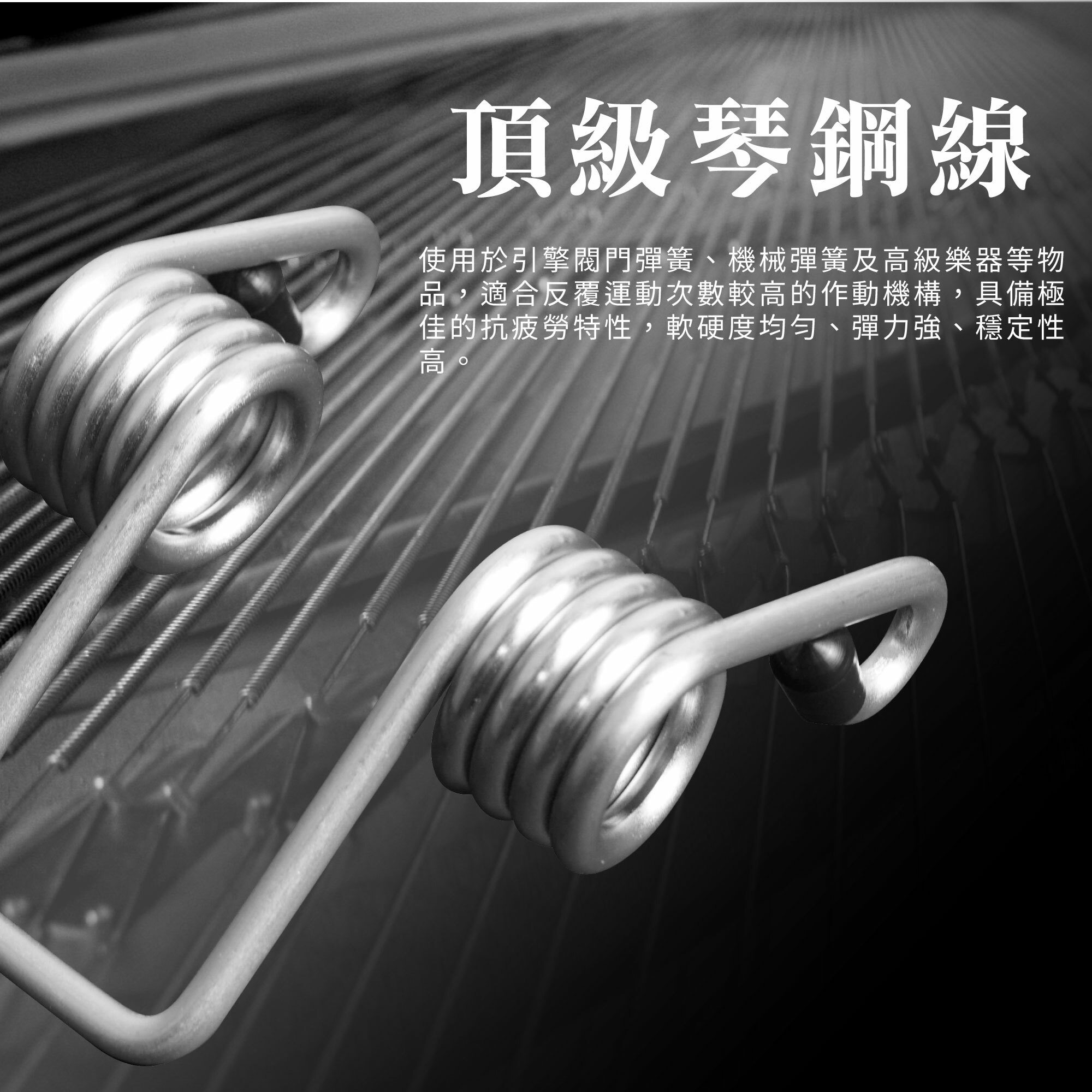 🥇琴鋼線一般用於引擎閥門彈簧、機械彈簧及高級樂器等,適合用於反覆運動次數較高的作動機構,具有極佳的抗疲勞特性,線材之軟硬度均勻、彈力強、穩定性高,完全進口材料,非3流彈簧鋼製造
