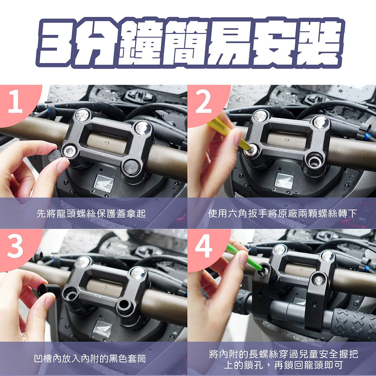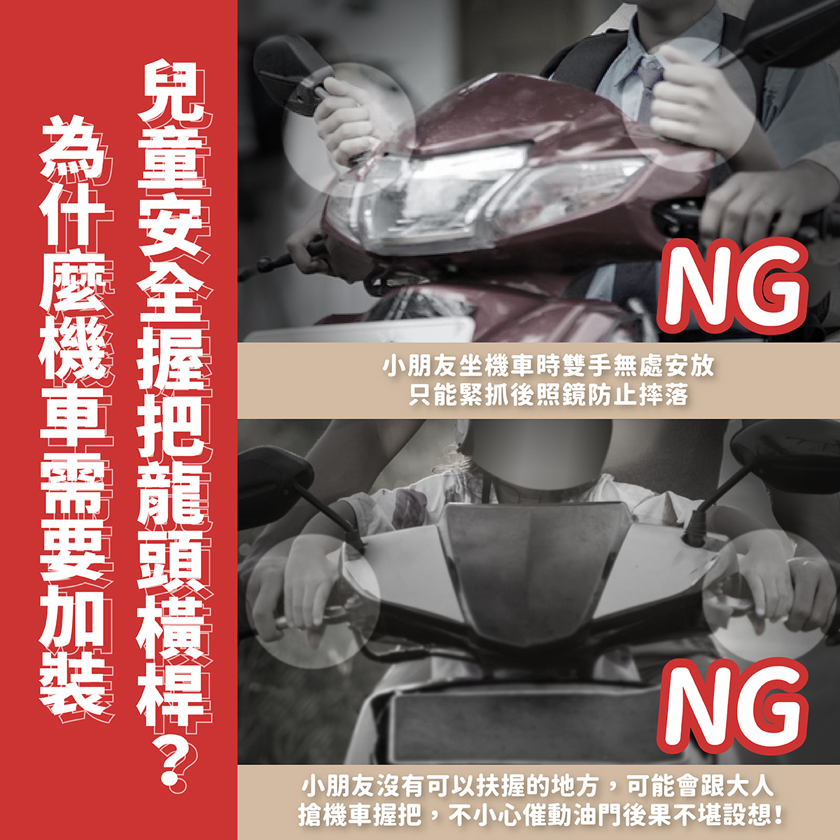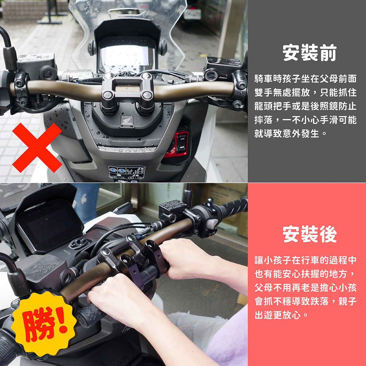 XILLA機車裸把專用兒童安全把手,專為機車裸把設計,提供小朋友在騎行過程中的額外安全保障。這款安全把手採用高強度材料製成,堅固耐用,能有效分擔兒童的騎行重心,減少乘客不穩定的情況。簡單的安裝方式讓車主輕鬆將把手固定於裸把上,無需額外改裝,適配大多數裸把車型。