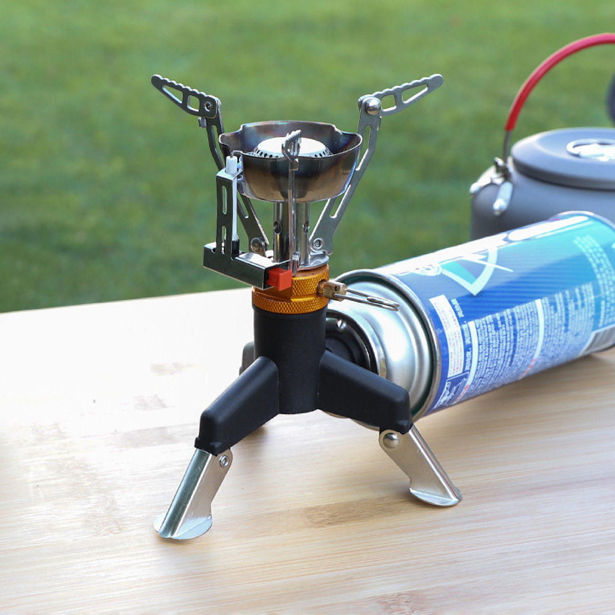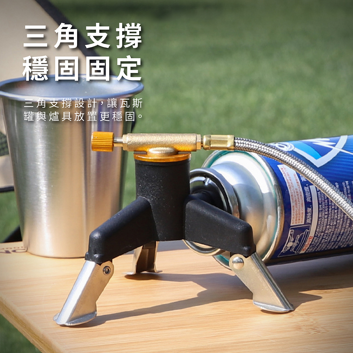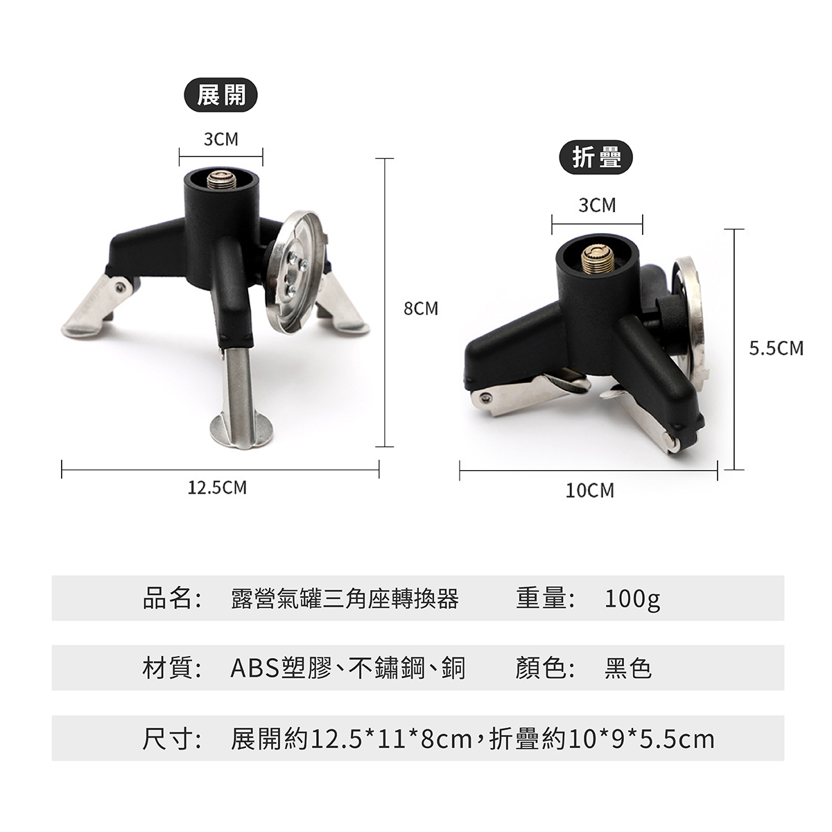 「露營氣罐三角座轉換器是一種露營用具,主要功能是將不同規格的氣罐接頭轉換為其他規格,以便讓露營者能夠使用不同型號的爐具或設備。轉換器輕便小巧,容易放入露營背包中,方便外出攜帶,安裝過程快速、無需工具,適合露營、徒步旅行等戶外活動時使用。」