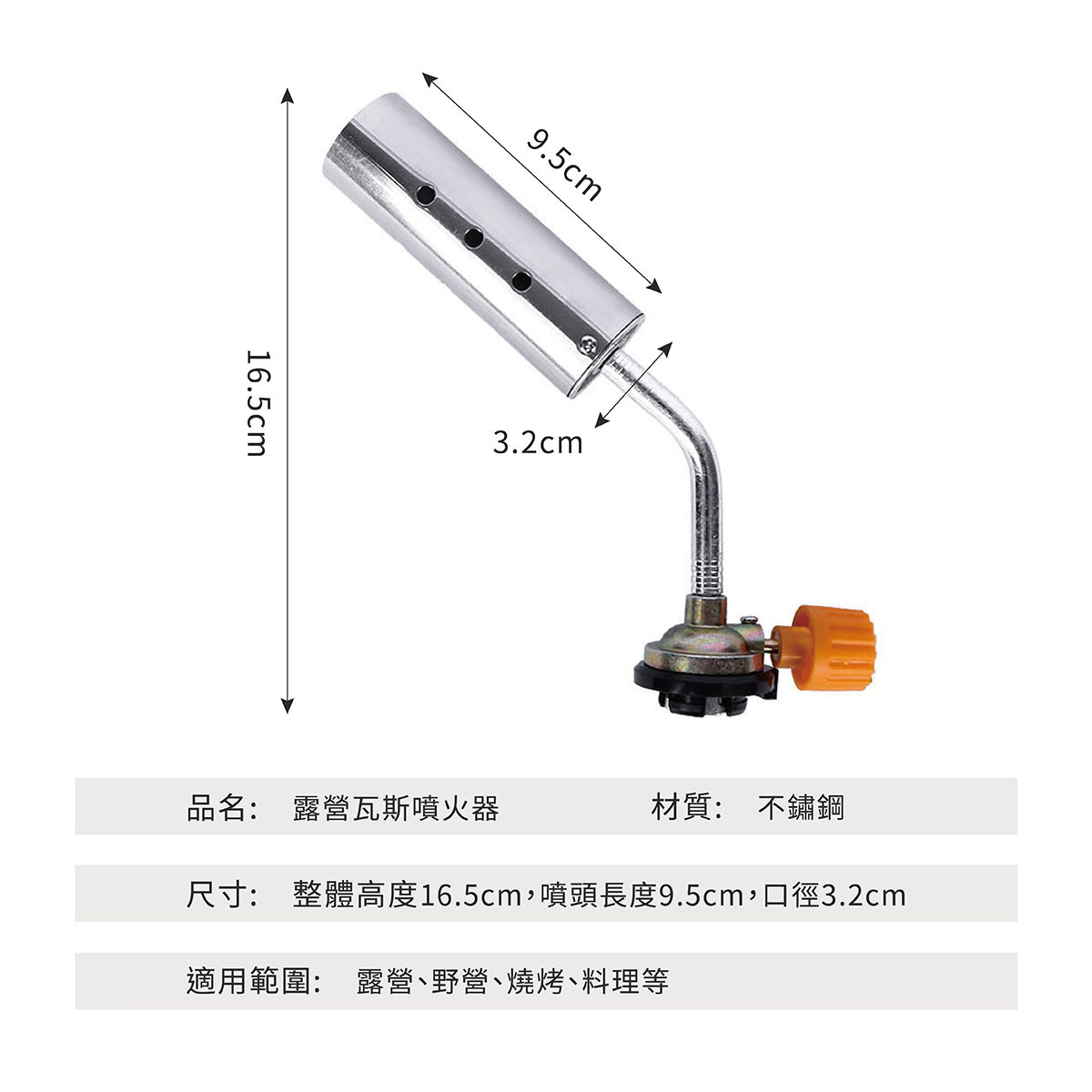 「露營瓦斯延伸噴火器是一種專為露營和戶外活動設計的工具,通常用於將瓦斯火焰延伸至更遠或更精確的位置。主要與露營爐具或其他使用瓦斯燃料的設備搭配使用,瓦斯延伸噴火器可以輕松安裝和拆卸,能夠更好地控制火焰的大小和方向,提升使用體驗。噴火器的延伸設計讓使用者能夠保持與火源的安全距離,減少燙傷或意外的風險。適合需要精確控制火焰、保持距離或增強火源範圍的露營者或戶外活動愛好者。」