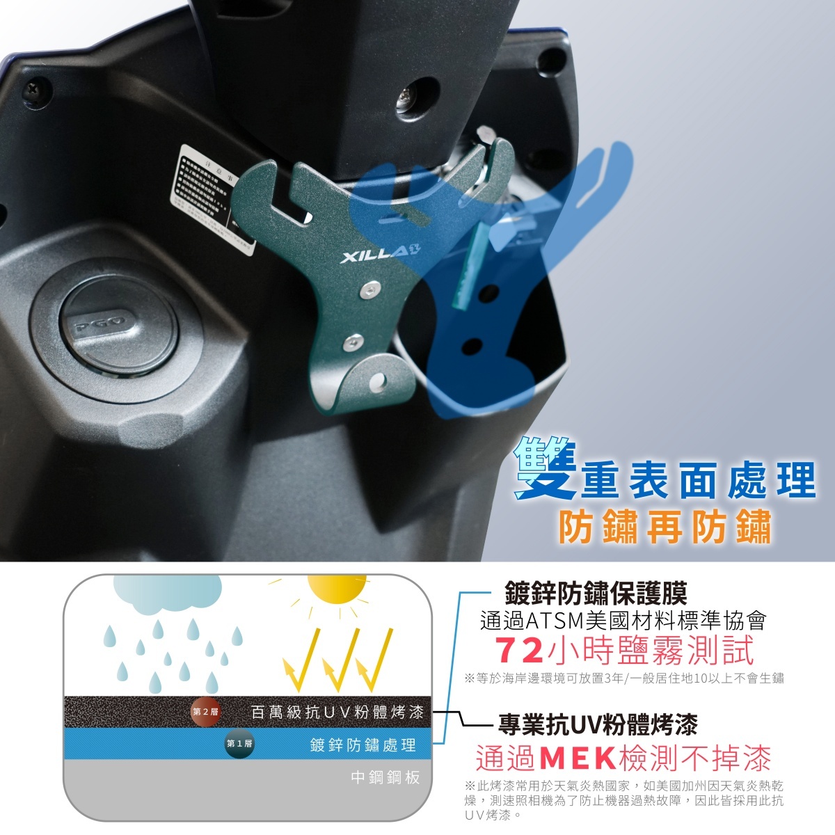 - **雙層防鏽處理:** 第一層鍍鋅防鏽保護層,第二層耐候性砂紋粉體烤漆,抗氧化性能卓越。