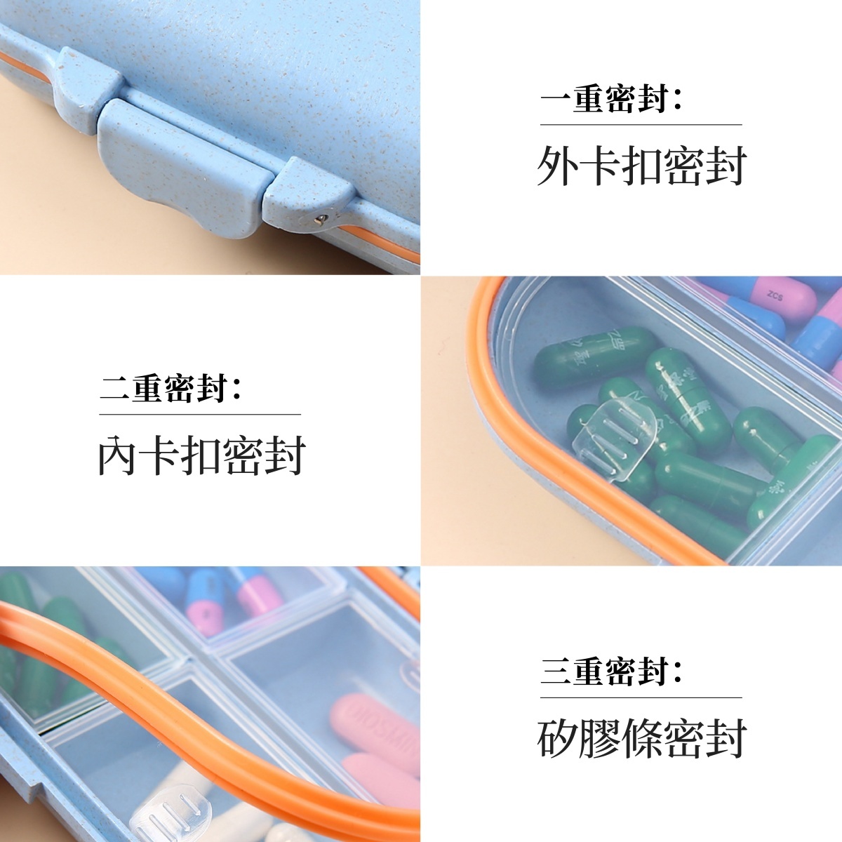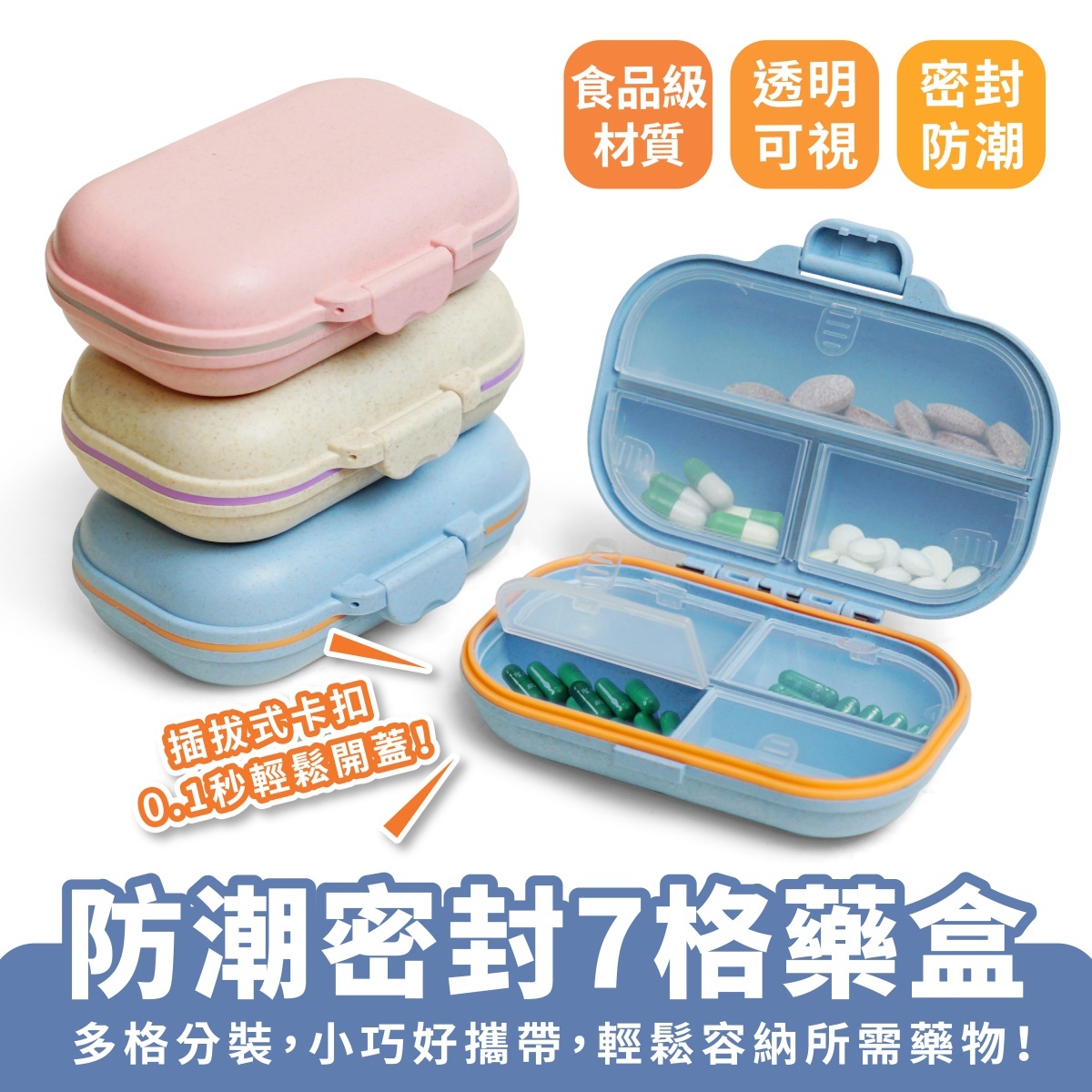 防潮密封7格藥盒,專為外出與日常用藥管理設計。小巧輕盈的尺寸,僅 11.1×8.2×3.7cm,收納方便不占空間,無論放包包、旅行袋都輕鬆無負擔。內部七格分裝設計,能清楚分類不同藥品或保健食品,避免混亂與誤食。採用插拔式卡扣設計,開蓋快速順手,一秒取藥不卡卡。整體使用食品級小麥秸稈+PP材質製成,無毒無異味,放心接觸藥物。密封性佳,有效防潮、防污染,守護藥品新鮮與品質,是日常或旅途中不可或缺的貼身收納小物。