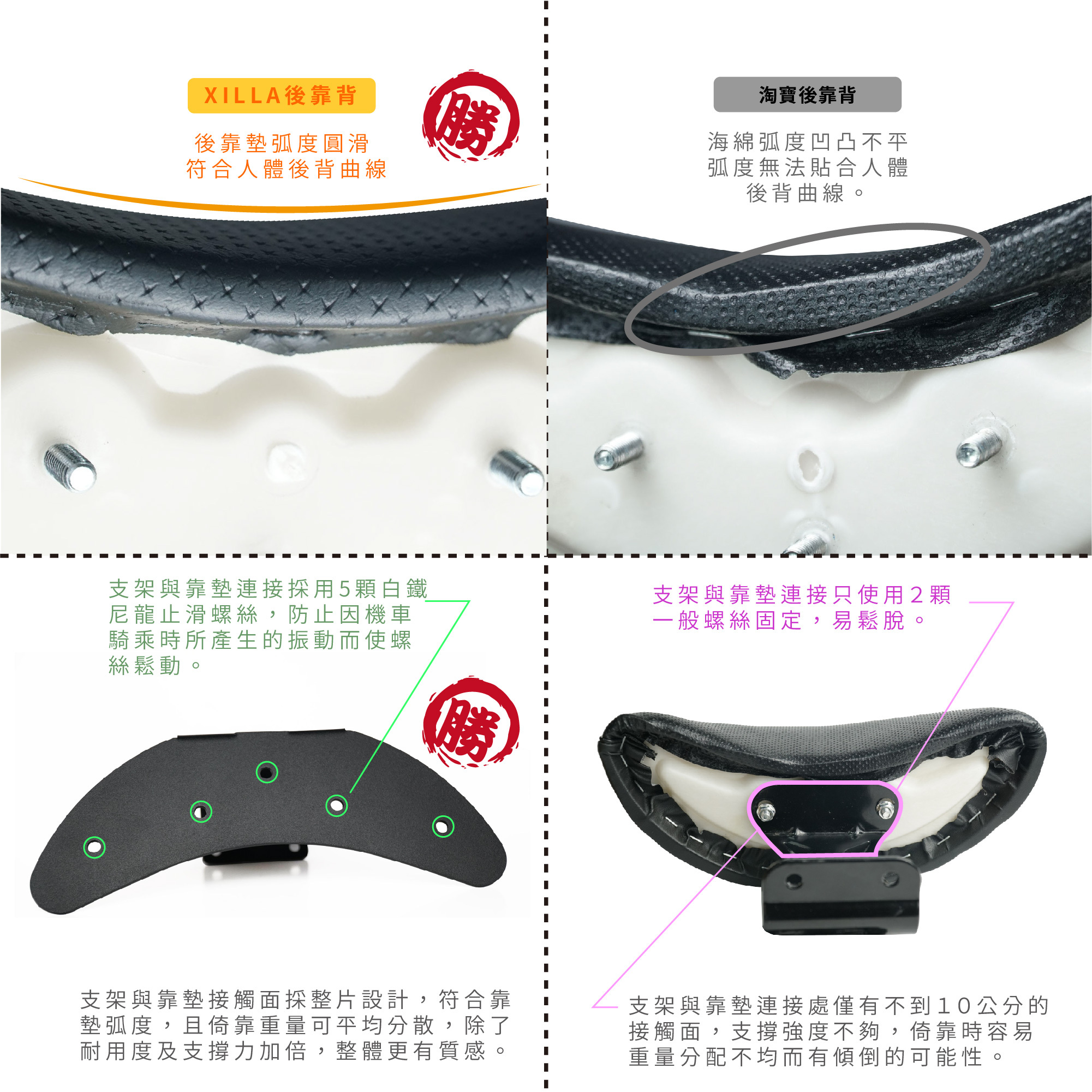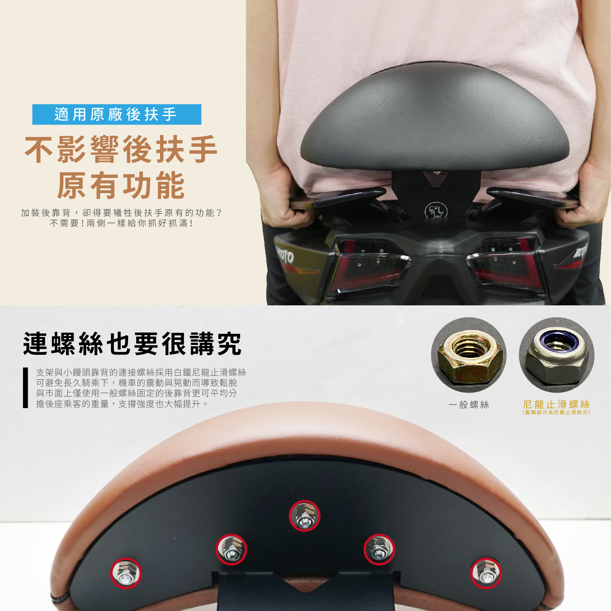 ✔️XILLA的後靠墊與固定支架連接的方式是使用5顆白鐵尼龍止滑螺絲,不會因為長久下來機車的震動與晃動而慢慢鬆脫,與一般市售的後靠背只有使用兩顆一般螺絲固定相比,不僅更能有效平均分擔後乘者的重量,支撐的強度也更高於3倍以上