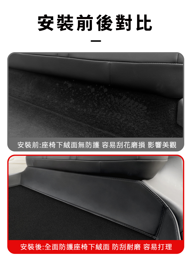 後排座椅下防護墊,專為特斯拉 Model 3/Y/煥新3量身定製,提供全面的底部防護。加長覆蓋設計有效防止灰塵、泥土和刮痕侵入車內,保持座椅底部潔淨。此防護墊緊密貼合車內原車弧度,安裝簡單,無需擔心與內裝不符的問題。讓您的愛車內部更加乾淨、整潔,並有效提升防護功能,適合日常使用及長途出行。