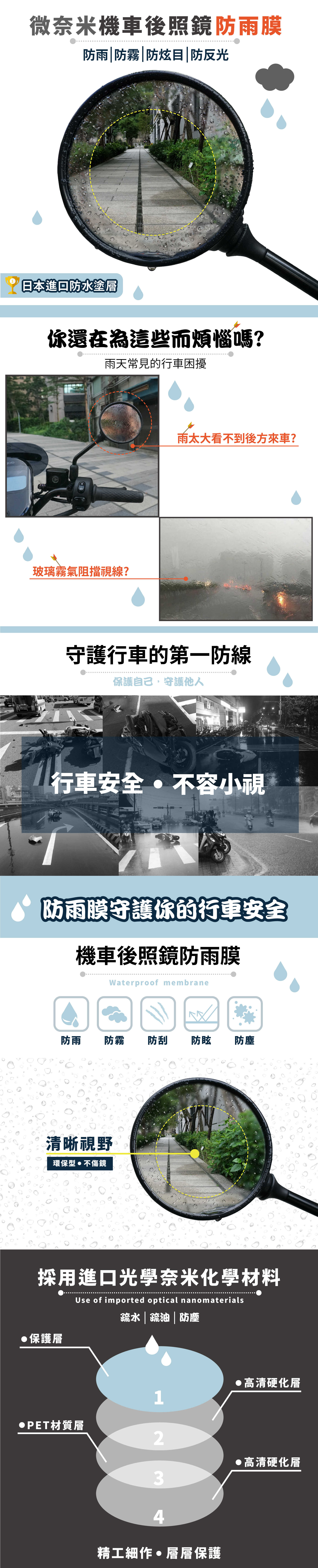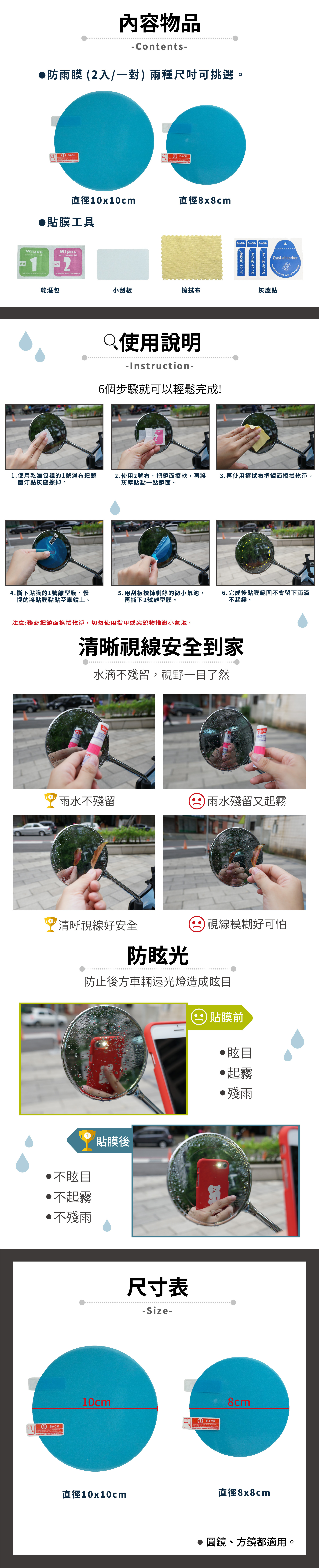機車通用型配件後照鏡防雨膜,專為機車後照鏡設計,有效防止雨水、灰塵及污漬影響視線,提升騎行安全。此防雨膜適用於圓形及方形後照鏡,安裝簡便,能夠緊密貼合鏡面,確保視野清晰,無論雨天還是霧氣,都能有效提高後方視野。材料具備防水、防霧功能,經久耐用,讓駕駛人在惡劣天氣下也能保持安全駕駛,減少視線模糊的風險。