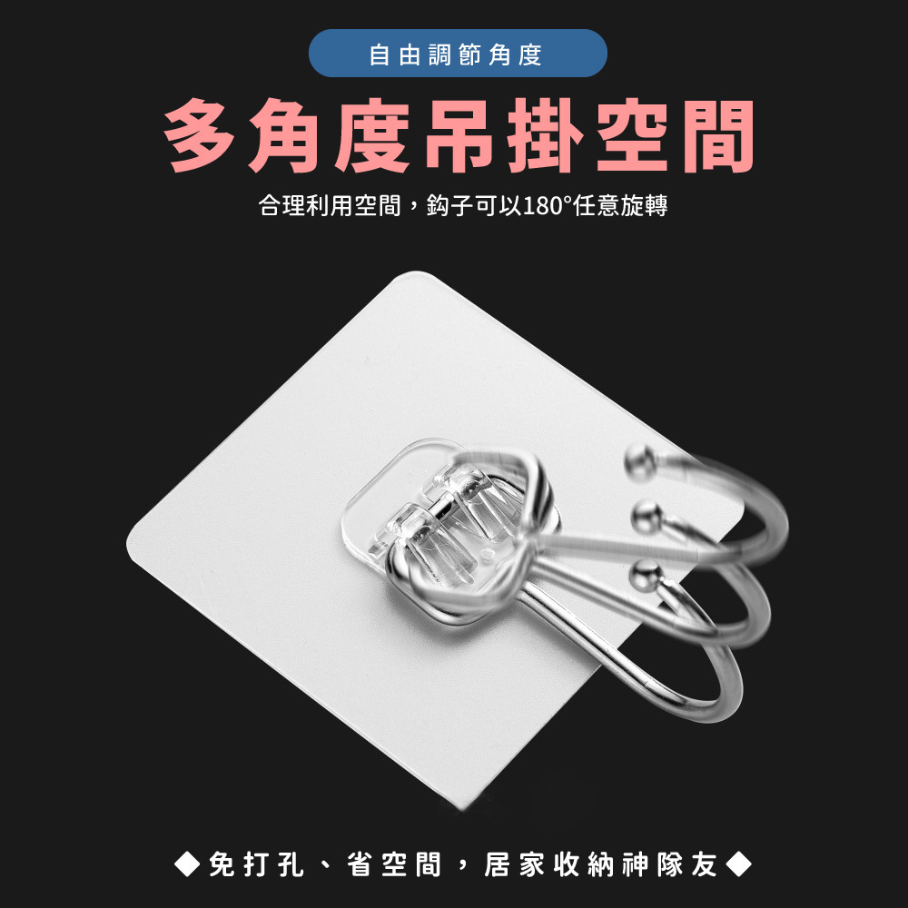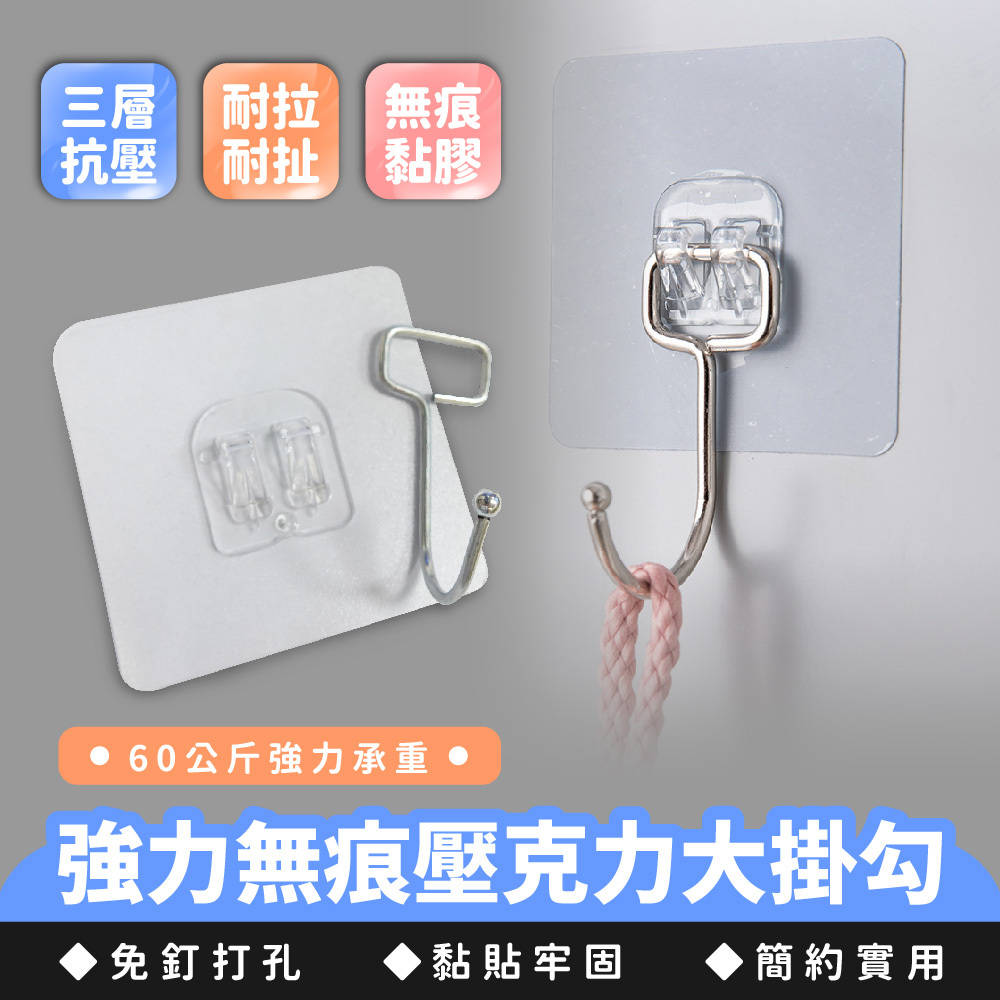 強力無痕壓克力大掛勾,採用高強度壓克力材質,承重力強,適合掛放衣物、包包、廚具等各類用品。無痕設計,不需打孔,安裝簡便,輕鬆固定且不留痕跡。耐用抗摔,兼顧美觀與實用,是居家、辦公室不可或缺的收納利器。