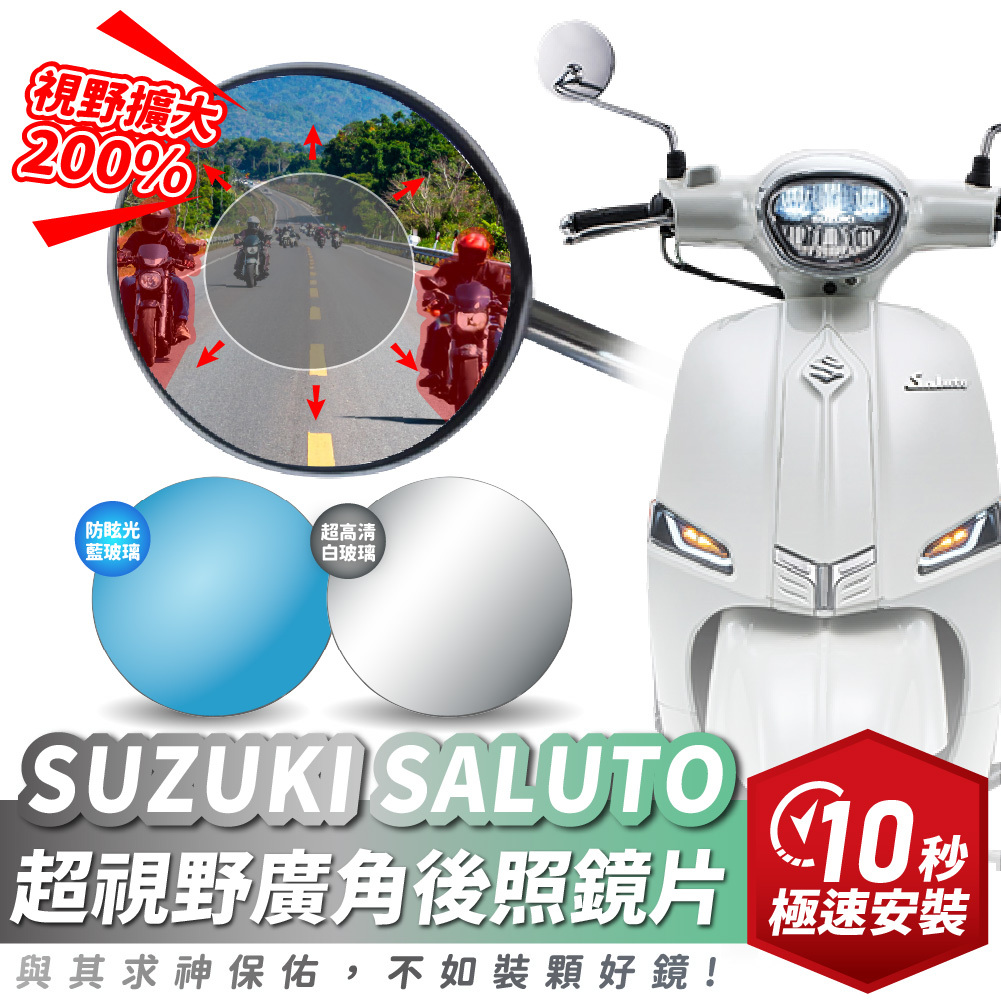 SUZUKI SALUTO 專用超視野廣角後照鏡片,採用高清鏡面材質,有效擴大後方視野,減少騎乘死角,提升行車安全。具防眩光功能,即使夜間或強光下依然清晰。鏡片表面經防水防霧處理,雨天騎乘依舊保持清晰視線。專車專用尺寸,安裝簡單穩固,不影響車身外觀,騎乘更安心。