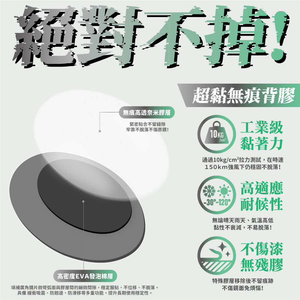 ► 耐極端環境:-30°C~120°C範圍內黏性不衰減,雨天、高溫皆可靠。