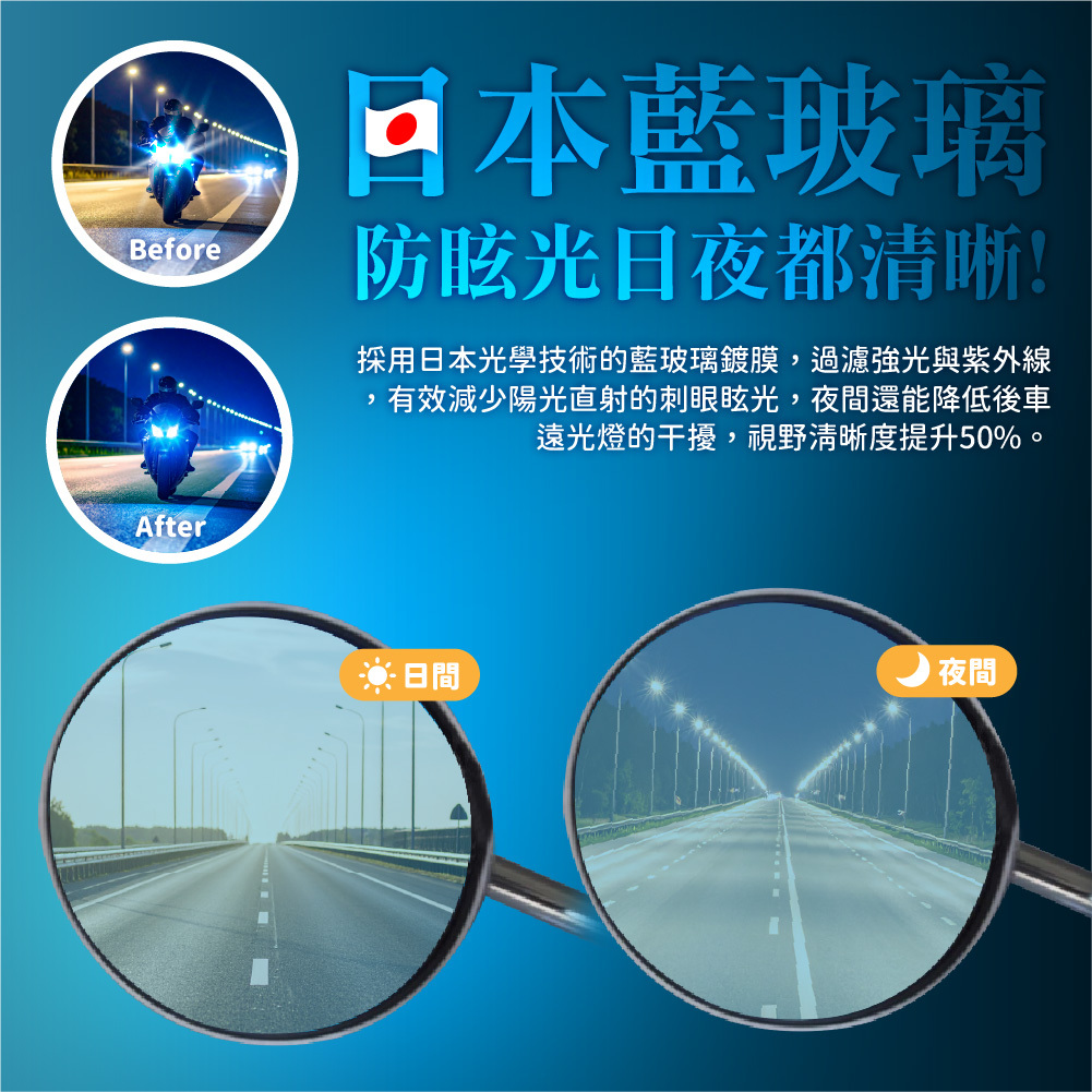 採用日本光學技術的藍玻璃鍍膜,過濾強光與紫外線,有效減少陽光直射的刺眼眩光,夜間還能降低後車遠光燈的干擾,視野清晰度提升50%。
