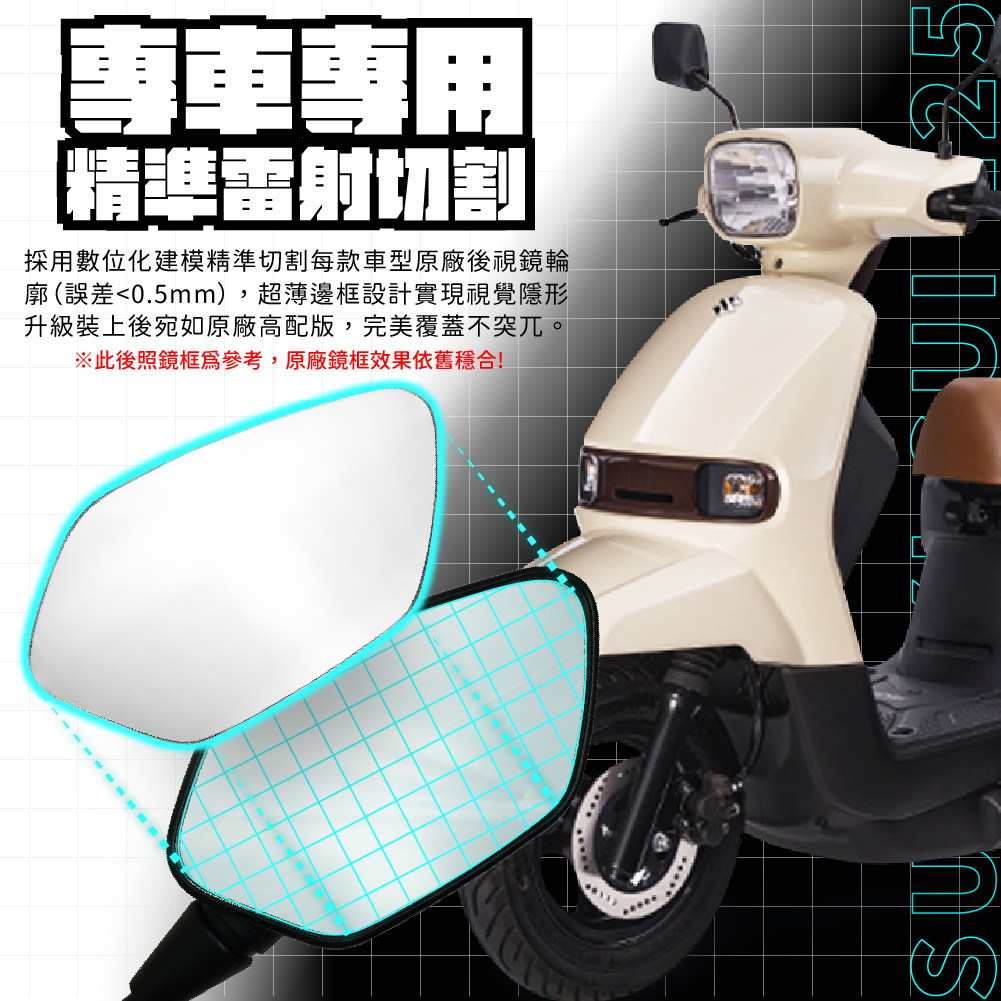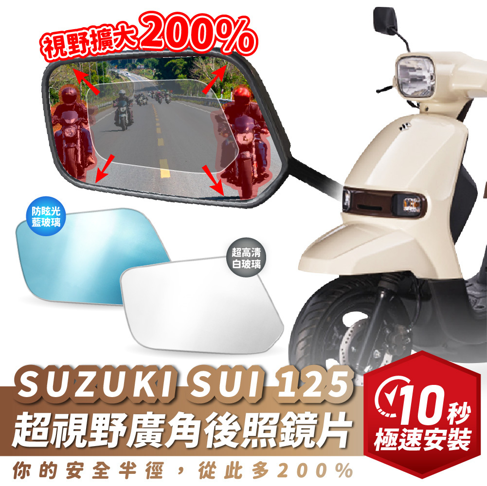 SUZUKI SUI 125 專用超視野廣角後照鏡片,採用高清鏡面材質,有效擴大後方視野,減少騎乘死角,提升行車安全。鏡片具防眩光功能,夜間或強光下依然清晰。表面經防水防霧處理,雨天也保持清晰視線。專車專用尺寸,安裝簡單穩固,不影響車身外觀,騎乘更安心。