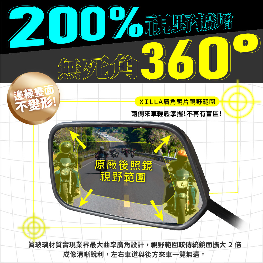 真玻璃材質實現 業界最大曲率 廣角設計,視野範圍較傳統鏡面擴大 2 倍,且邊緣無魚眼變形,左右車道與後方來車一覽無遺。