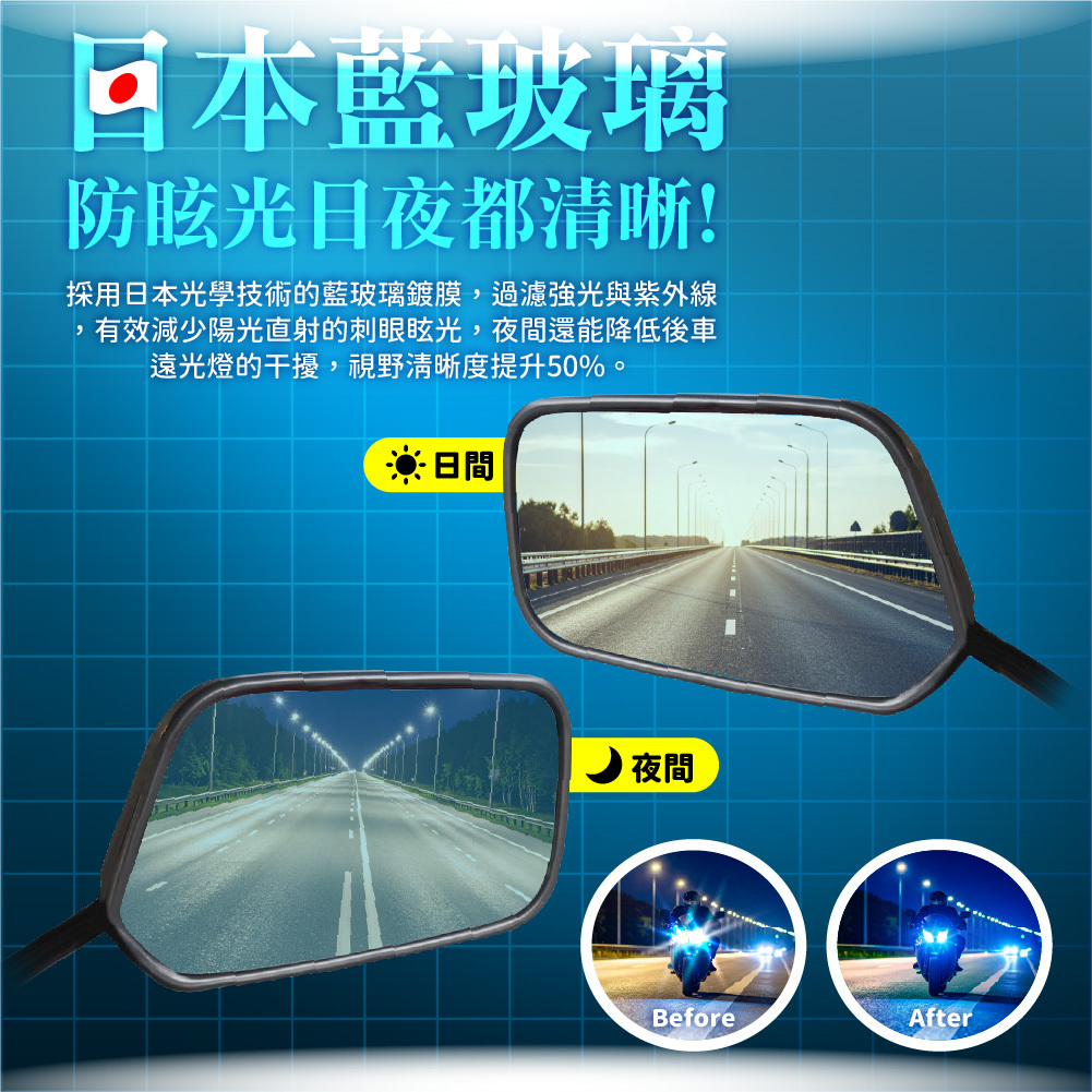 採用日本光學技術的藍玻璃鍍膜,過濾強光與紫外線,有效減少陽光直射的刺眼眩光,夜間還能降低後車遠光燈的干擾,視野清晰度提升50%。