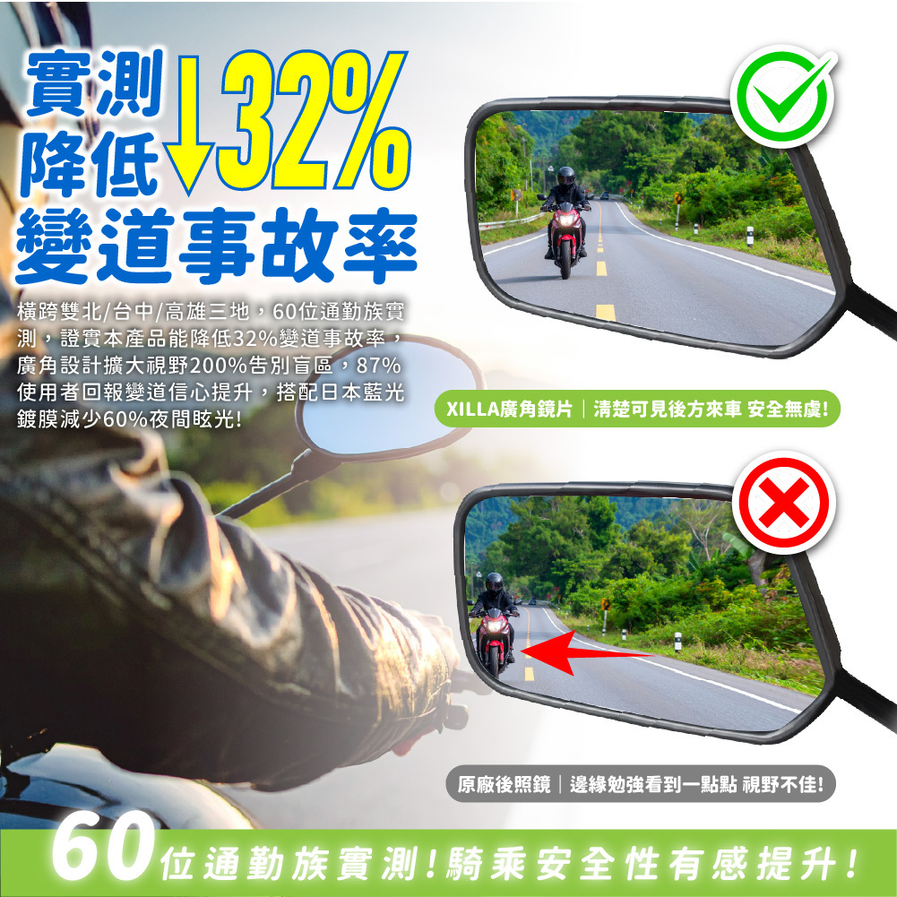 橫跨雙北/台中/高雄三地,60位通勤族實測,證實本產品能降低32%變道事故率,廣角設計擴大視野200%告別盲區,87%使用者回報變道信心提升,搭配日本藍光鍍膜減少60%夜間眩光