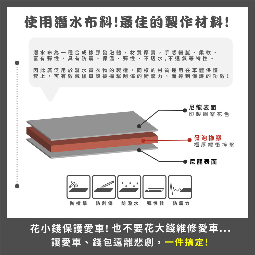 ⚠️此布料為極厚橡膠材質潛水布,而運送過程中必須對折才能寄送,壓到就會有些許摺痕,為正常現象不是瑕疵品,但是請不用擔心!橡膠材質具有伸縮的特性,長時間套用在車上可使壓痕淡化或藉由手動拉扯加速回彈效果!