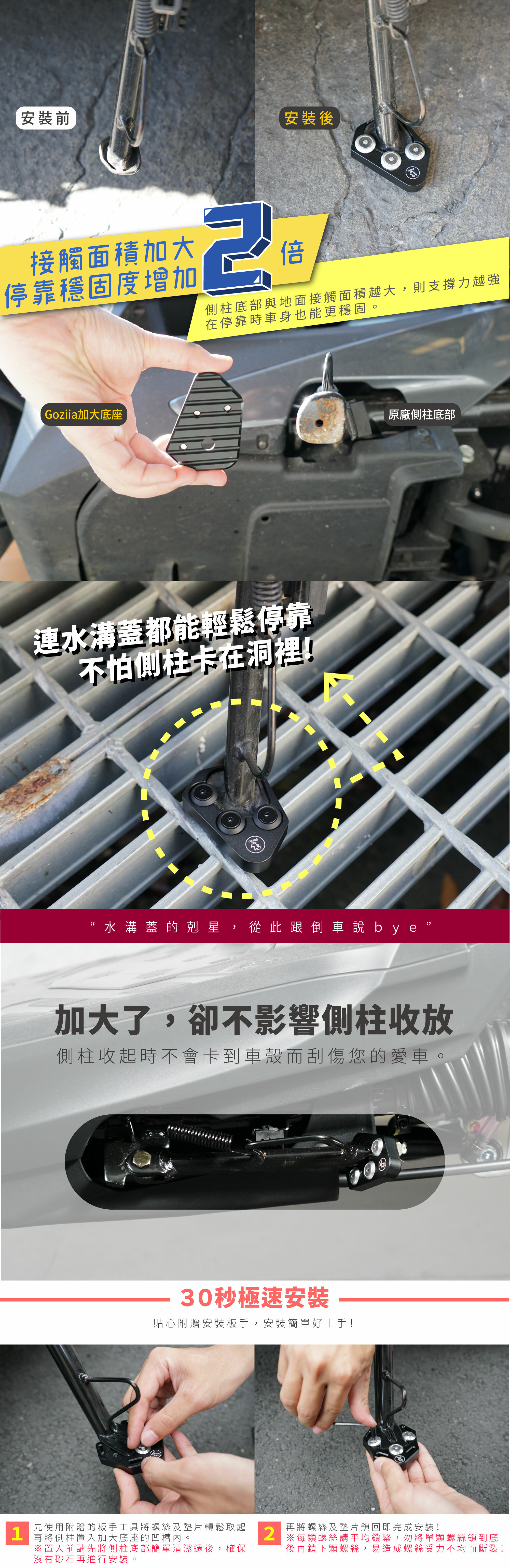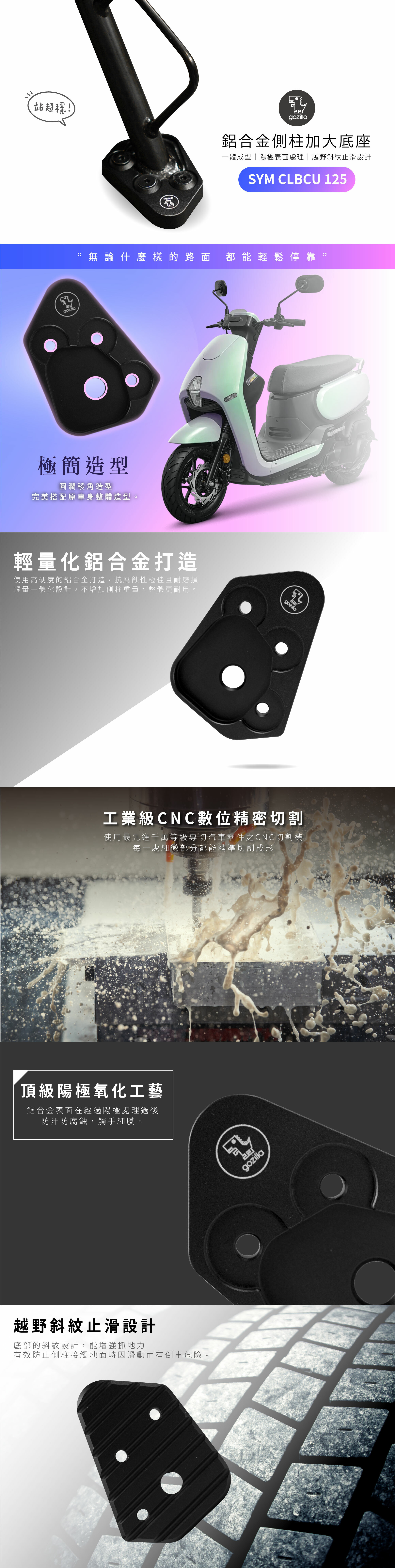 SYM CLBCU 125 鋁合金側柱加大底座,專為提升車輛穩定性與支撐力而設計。此加大底座採用高強度鋁合金材質,具有輕量化與耐用性,能有效增強車輛側柱的穩定性,防止側柱變形或損壞,提升整體車輛的使用壽命。加大設計可提供更好的支撐力,確保車主在日常駕駛及停車過程中更加安全穩定。安裝簡便,完美貼合SYM CLBCU 125,無需改裝即可輕鬆升級,讓車主在享受騎行的同時,也能提升車輛的耐用度與性能。