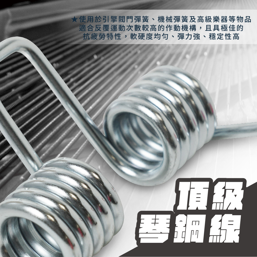 🥇琴鋼線一般用於引擎閥門彈簧、機械彈簧及高級樂器等,適合用於反覆運動次數較高的作動機構,具有極佳的抗疲勞特性,線材之軟硬度均勻、彈力強、穩定性高,完全進口材料,非3流彈簧鋼製造