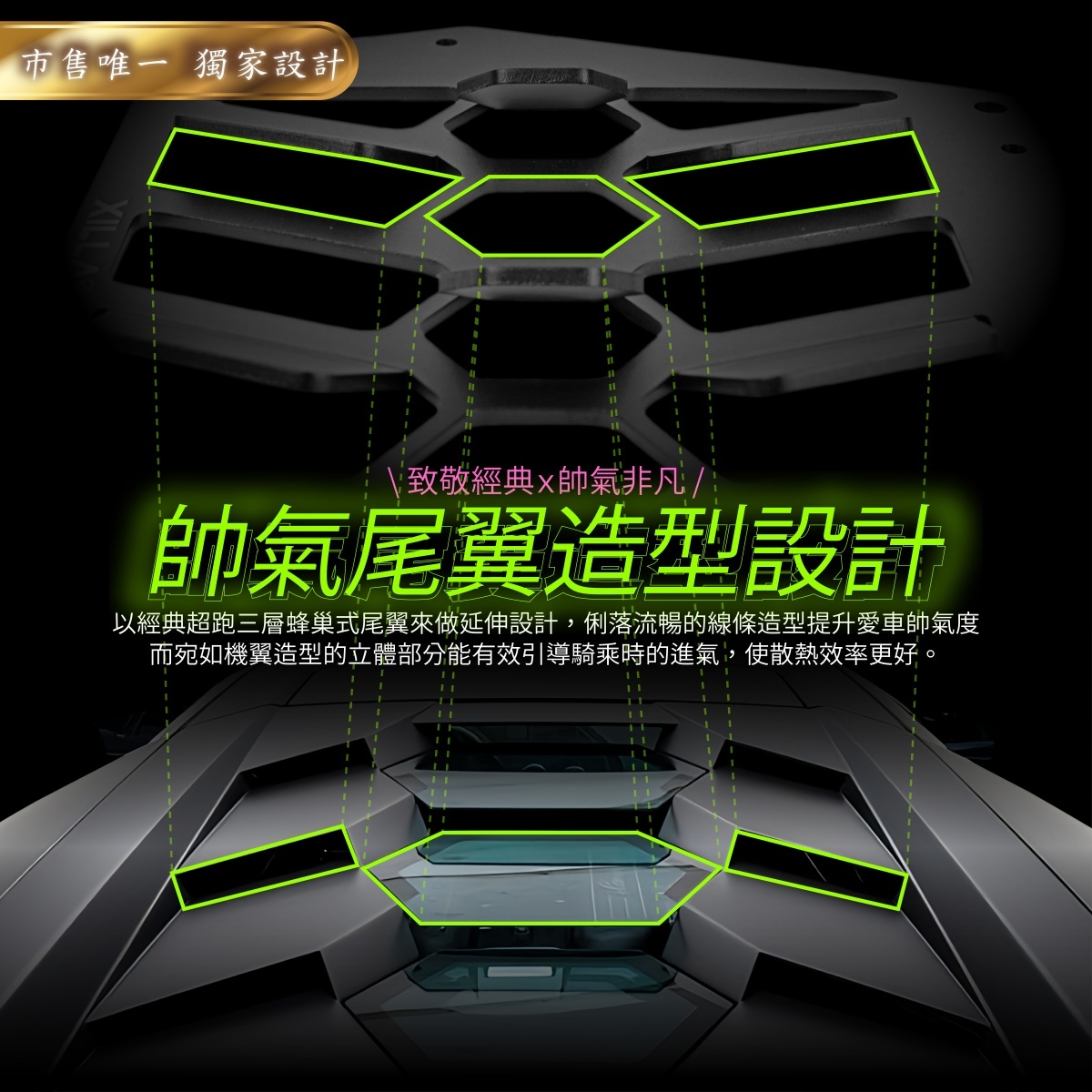 🏆 獨家設計蜂巢防護網**:靈感源於超跑三層蜂巢後引擎蓋與戰機尾翼,打造特殊立體導風造型。