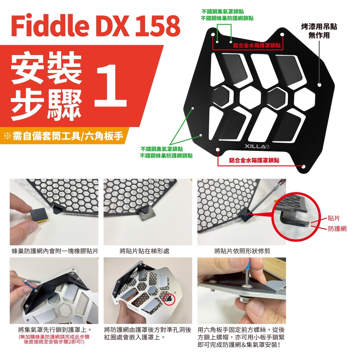 FIDDLE DX 水冷 158 鋁合金水箱護罩專為保護水箱免受碎石、雜物和撞擊而設計。採用耐用鋁合金材質,提供更強的防護效果,延長水箱使用壽命,並保持輕巧且時尚的外觀。非常適合越野車與街車使用。