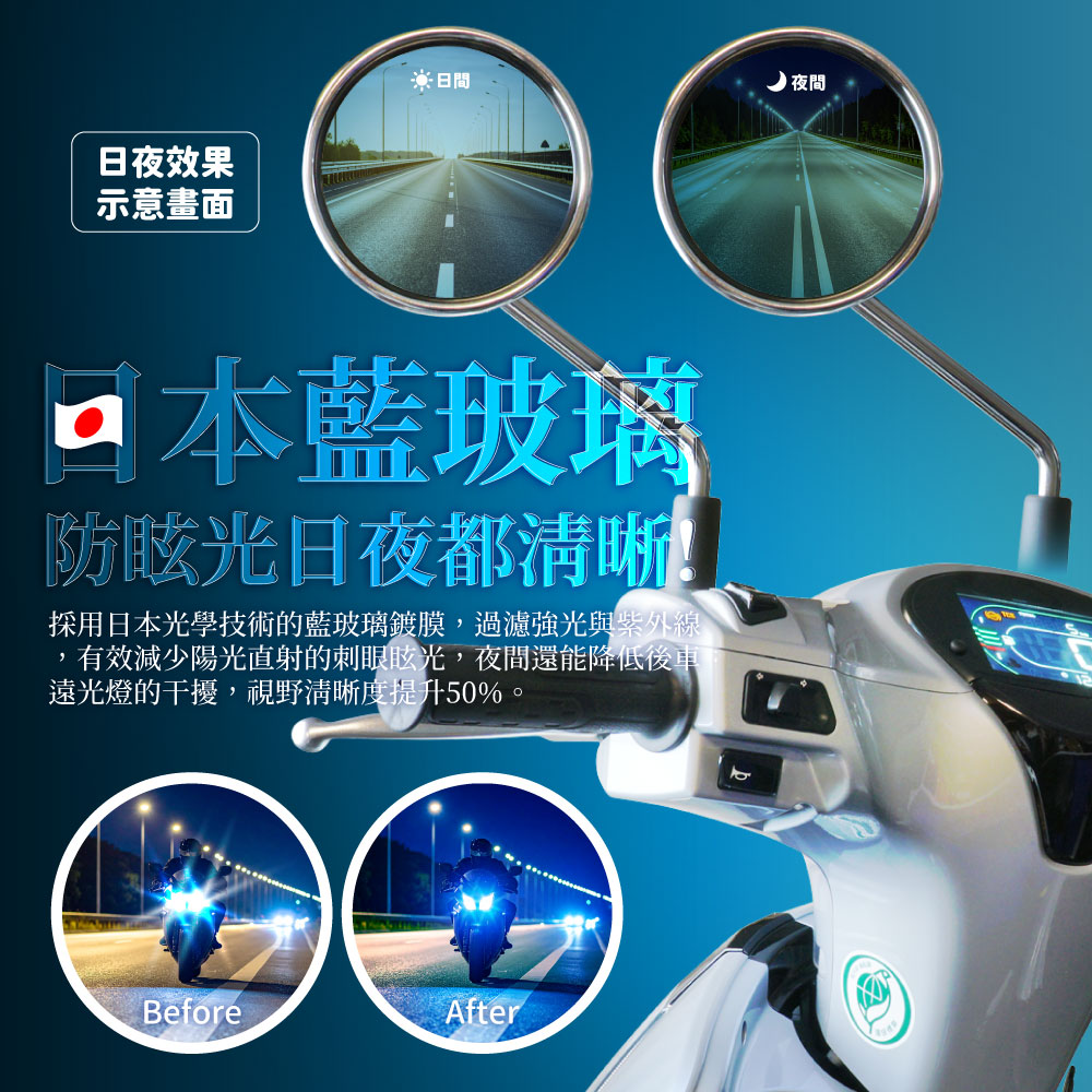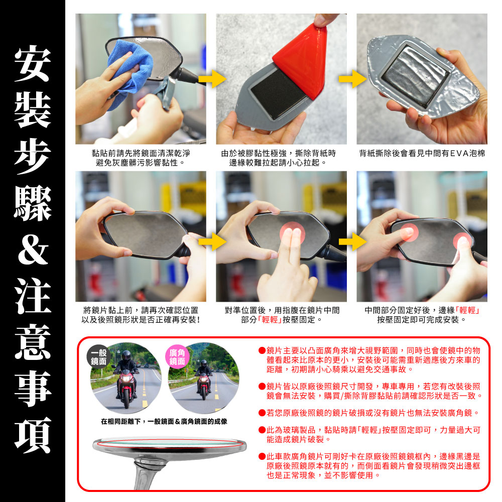 ●鏡片主要以凸面廣角來增大視野範圍,同時也會使鏡中的物體看起來比原本的更小,安裝後可能需重新適應後方來車的距離,初期請小心騎乘以避免交通事故。