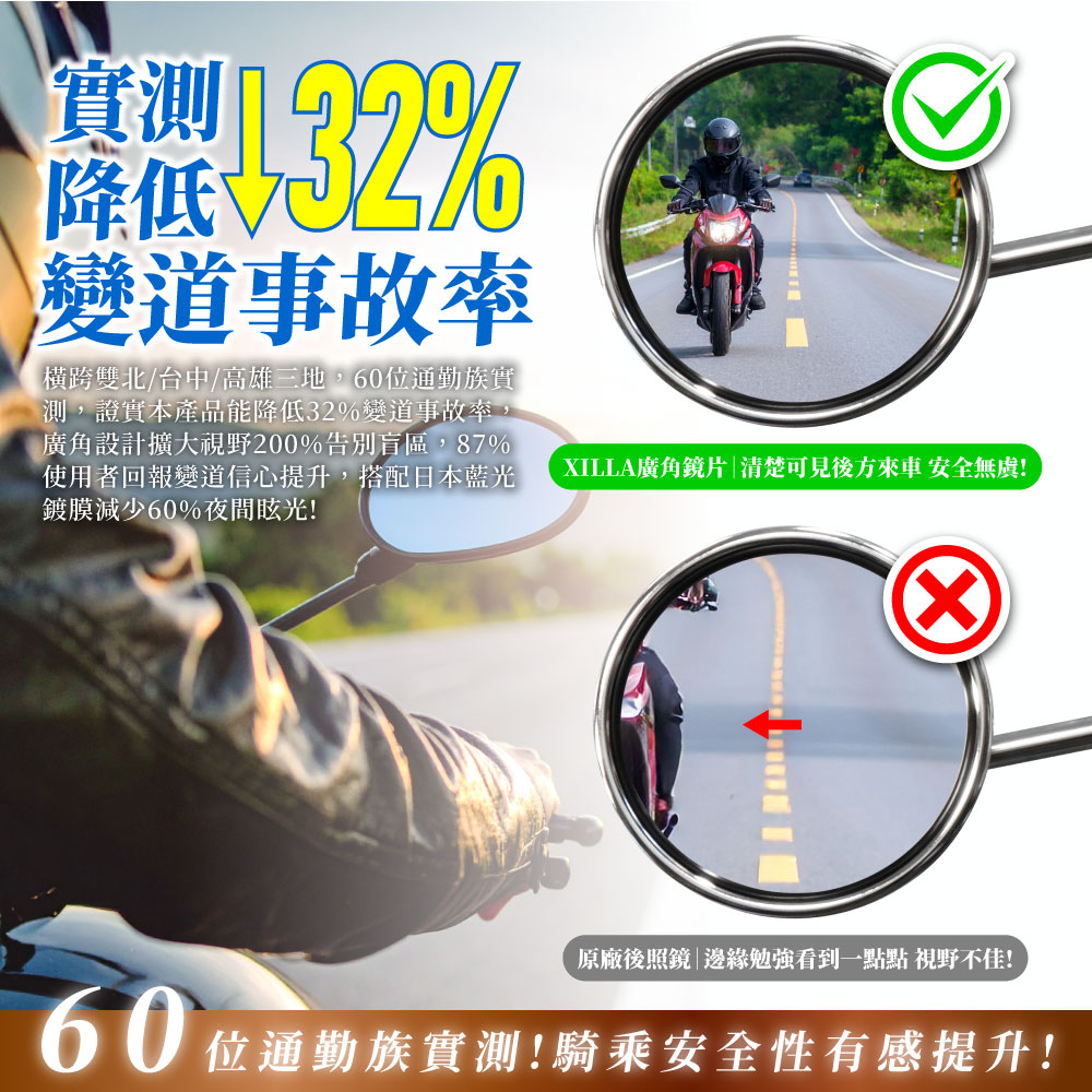 橫跨雙北/台中/高雄三地,60位通勤族實測,證實本產品能降低32%變道事故率,廣角設計擴大視野200%告別盲區,87%使用者回報變道信心提升,搭配日本藍光鍍膜減少60%夜間眩光