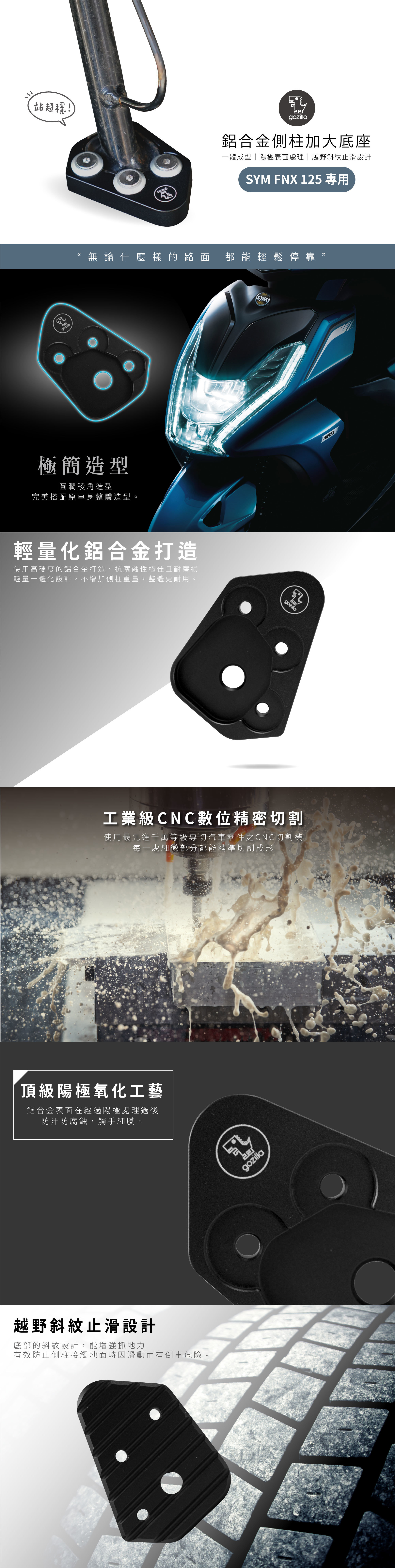 SYM FNX 125 鋁合金側柱加大底座,專為提升車輛穩定性與支撐力而設計。此加大底座採用高強度鋁合金材質,具有輕量化與耐用性,能有效增強車輛側柱的穩定性,防止側柱變形或損壞,提升整體車輛的使用壽命。加大設計可提供更好的支撐力,確保車主在日常駕駛及停車過程中更加安全穩定。安裝簡便,完美貼合SYM FNX 125,無需改裝即可輕鬆升級,讓車主在享受騎行的同時,也能提升車輛的耐用度與性能。