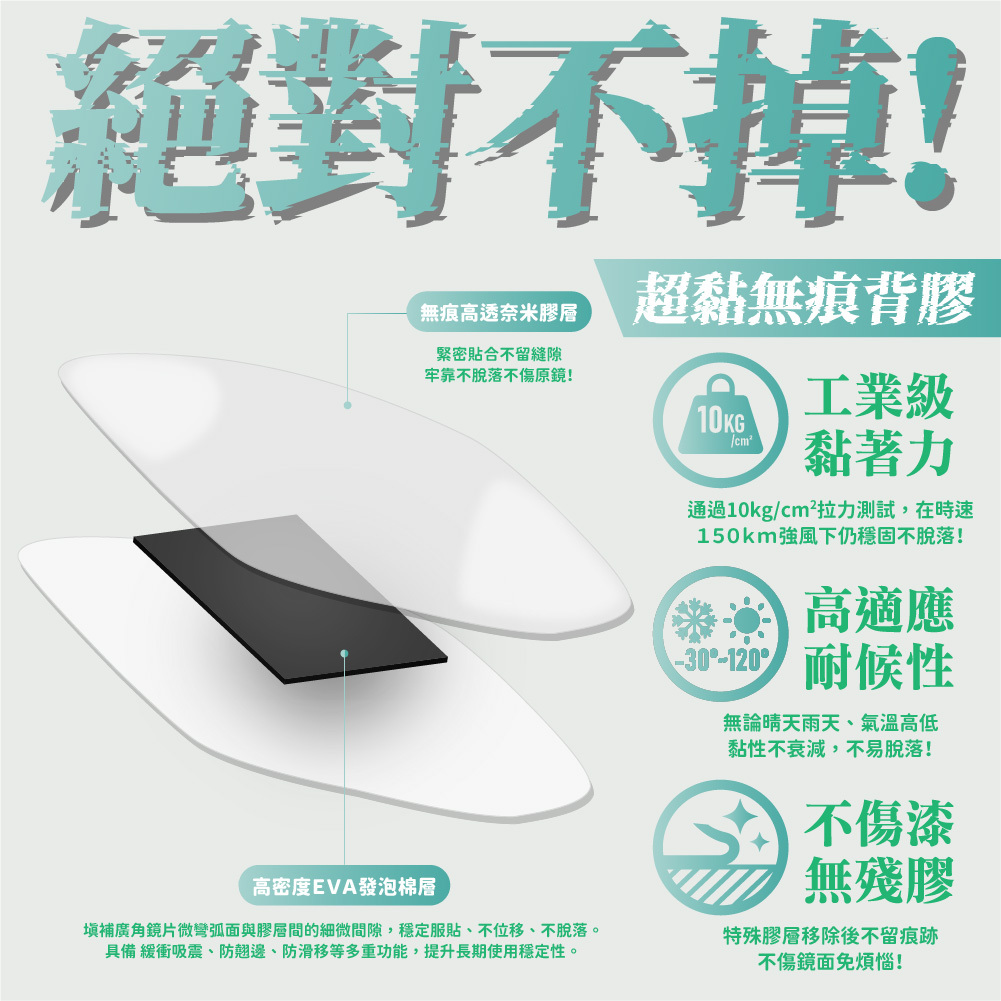 真玻璃鏡面經 薄型化處理(厚度 1.2mm),整體重量比同級產品輕 30%,完全不影響車身配重與風阻。