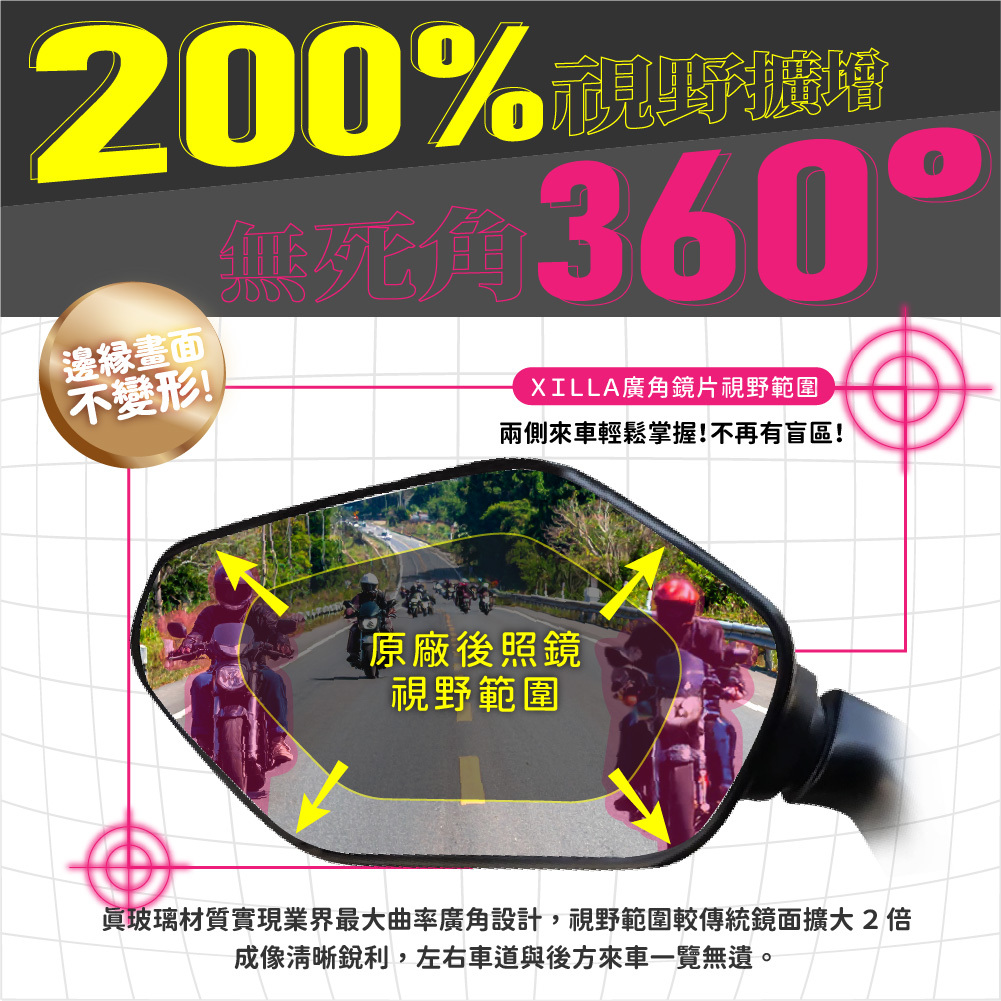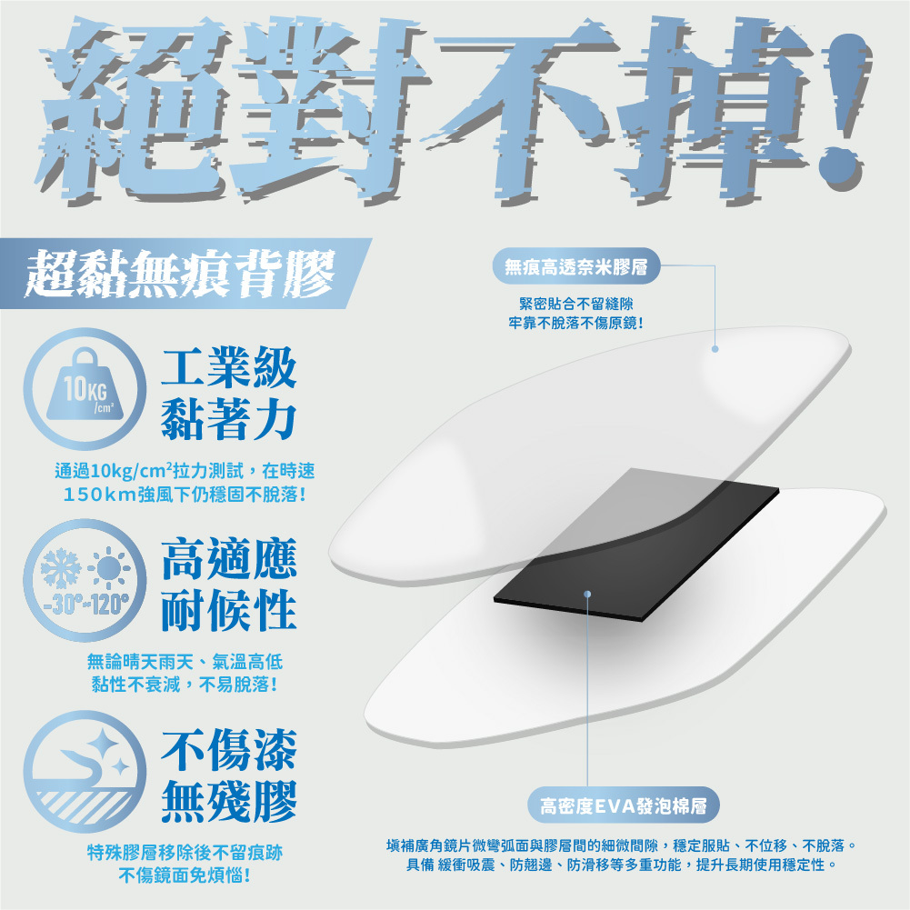 真玻璃材質實現 業界最大曲率 廣角設計,視野範圍較傳統鏡面擴大 2 倍,且邊緣無魚眼變形,左右車道與後方來車一覽無遺。