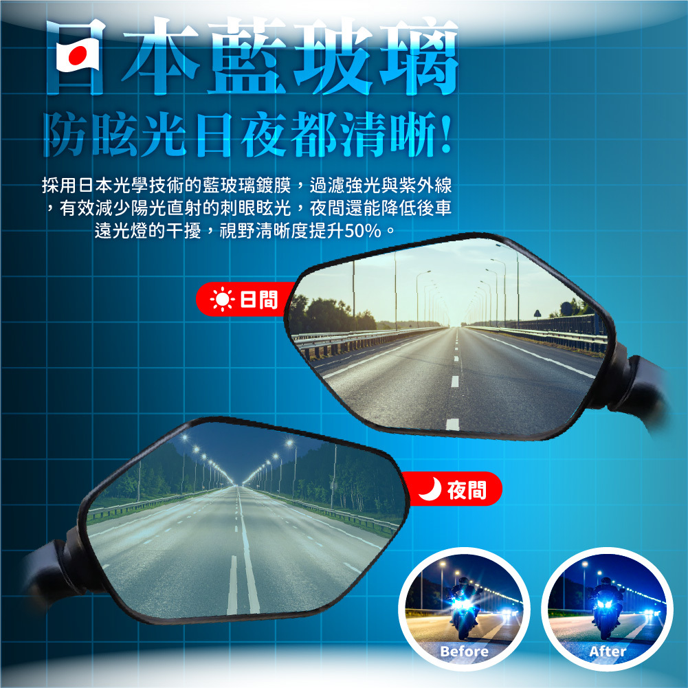 採用日本光學技術的藍玻璃鍍膜,過濾強光與紫外線,有效減少陽光直射的刺眼眩光,夜間還能降低後車遠光燈的干擾,視野清晰度提升50%。