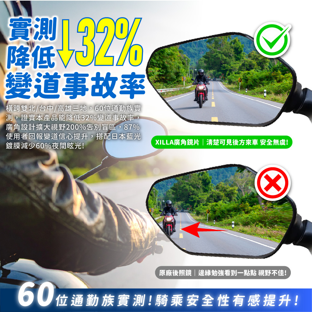 橫跨雙北/台中/高雄三地,60位通勤族實測,證實本產品能降低32%變道事故率,廣角設計擴大視野200%告別盲區,87%使用者回報變道信心提升,搭配日本藍光鍍膜減少60%夜間眩光