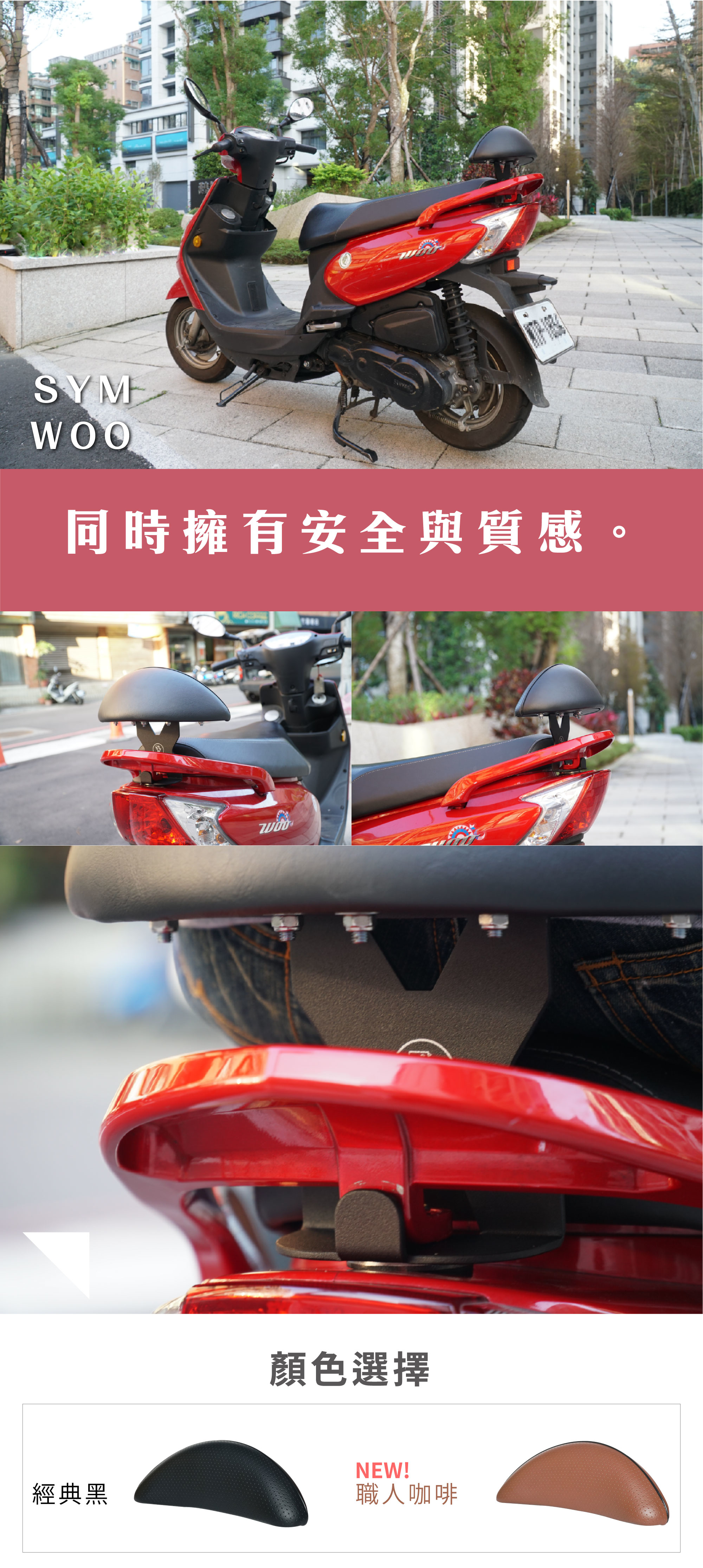 🌟此頁面為SYM WOO 100/115專用後靠背,可配合原廠後扶手的角度安裝,若您的後扶手有自行改裝,請先詢問小編是否能安裝再下單購買喔!