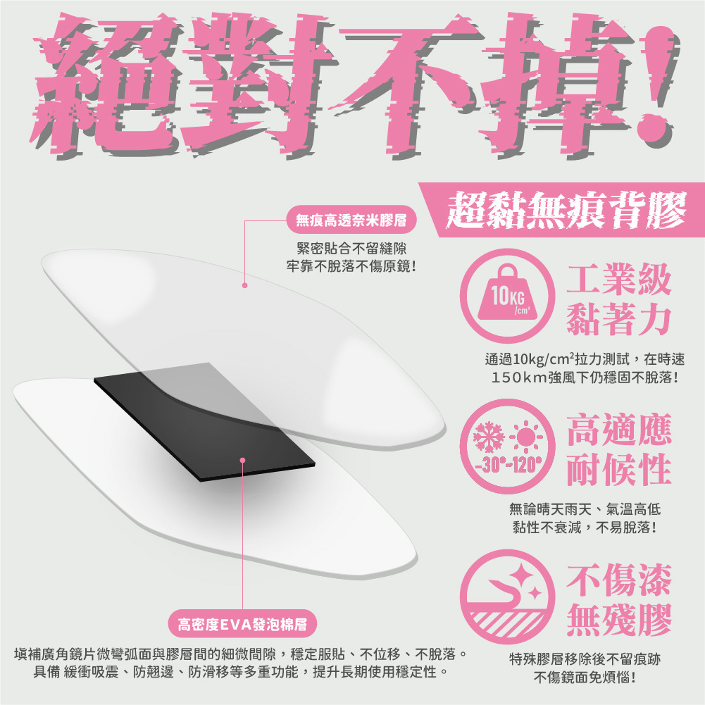 ► 耐極端環境:-30°C~120°C範圍內黏性不衰減,雨天、高溫皆可靠。