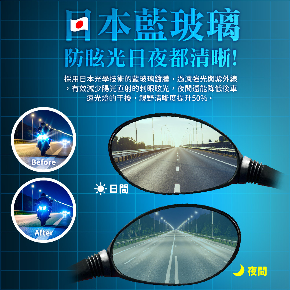 採用日本光學技術的藍玻璃鍍膜,過濾強光與紫外線,有效減少陽光直射的刺眼眩光,夜間還能降低後車遠光燈的干擾,視野清晰度提升50%。