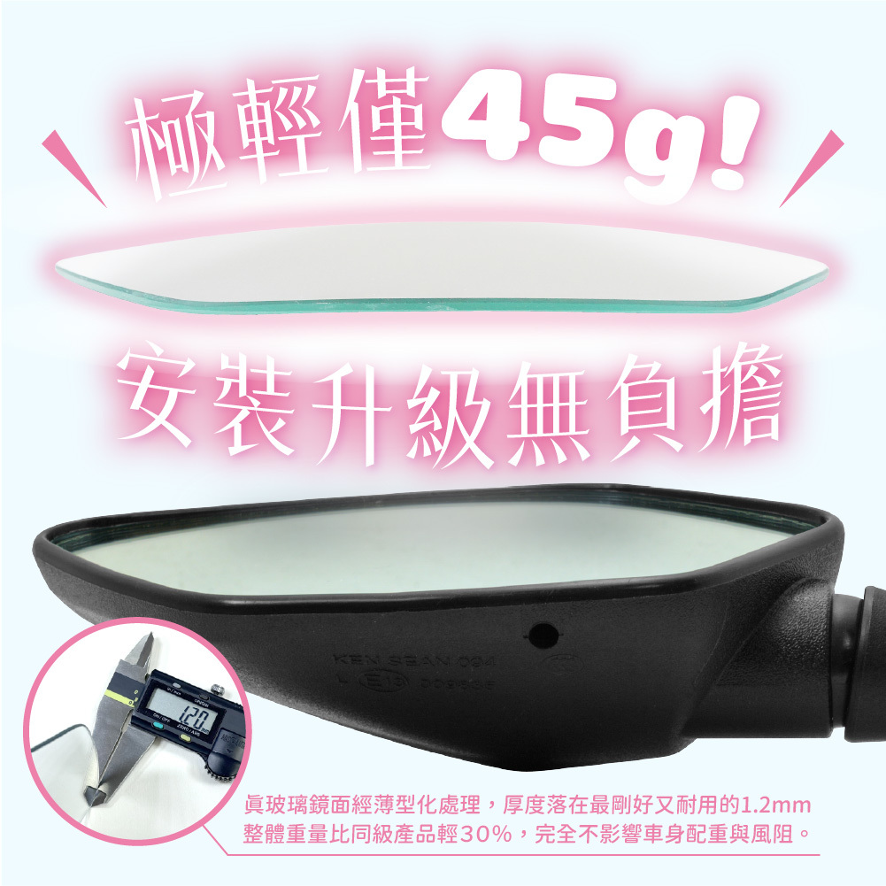 真玻璃鏡面經 薄型化處理(厚度 1.2mm),整體重量比同級產品輕 30%,完全不影響車身配重與風阻。