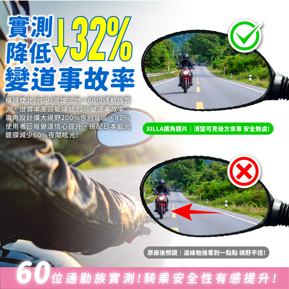 橫跨雙北/台中/高雄三地,60位通勤族實測,證實本產品能降低32%變道事故率,廣角設計擴大視野200%告別盲區,87%使用者回報變道信心提升,搭配日本藍光鍍膜減少60%夜間眩光