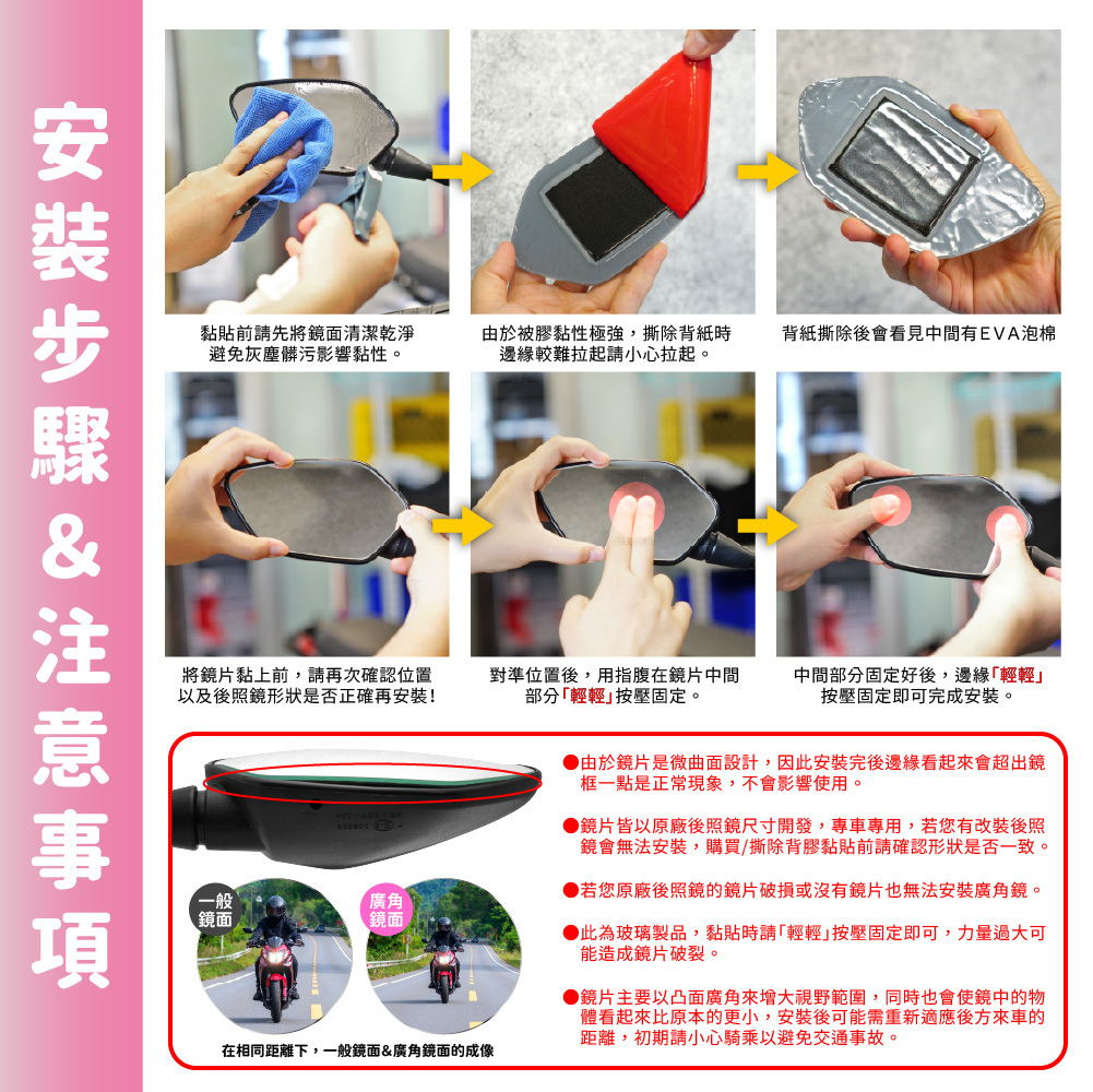 ●鏡片主要以凸面廣角來增大視野範圍,同時也會使鏡中的物體看起來比原本的更小,安裝後可能需重新適應後方來車的距離,初期請小心騎乘以避免交通事故。